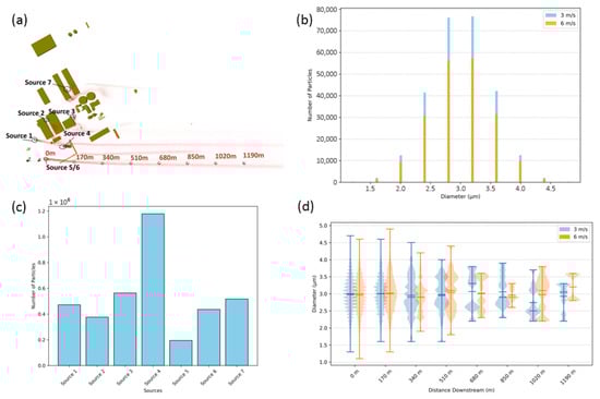 Graphs illustrating (a) the different particle source placements; (b) the particle source diameter distribution, comparing the differences between velocities of 3 m/s and 6 m/s at point (X = 1190 m, Y = 0 m, and Z = 2 m); (c) the particle count at each source location for a velocity of 3 m/s; (d) a violin plot depicting the downstream evolution (at positions depicted in (a)) of particle size distribution under varying wind speeds.