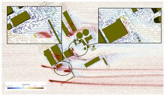 Furthermore, Figure 14 depicts the detailed velocity-vector field surrounding Sources 3 and 4. The close-up of Source 4 (left) shows a distinct wake region generated by the L-shaped building, where local recirculation traps particles and increases residence time. In contrast, the flow around Source 3 (right) exhibits a combination of shielding and lateral channeling that promotes particle clustering along the building façade. The visualization confirms that localized geometry-induced vortices substantially influence both flow reattachment zones and subsequent pollutant accumulation patterns within the industrial complex.