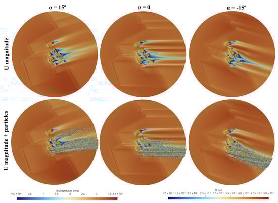 Particle–wall interactions were handled using a localInteraction model: solid surfaces were assigned rebound behavior, the sea surface was treated as perfectly sticking, and open boundaries—including inlet, outlet, lateral faces, and the source baffles—were specified as escape patches, allowing particles to leave the computational domain. In the present configuration, both terrain and building surfaces were treated as rigid walls and assigned the same rebound interaction with high normal and tangential restitution coefficients ( and ), reflecting the predominance of paved and hard structural materials in the study area. For the micron-sized particles considered here (mean diameter ≈ 3 μm), size-resolved dry deposition studies indicate that rebound effects mainly influence coarse particles larger than about 5–10 μm, while fine particles are governed by turbulent diffusion, impaction, and gravitational settling and are only weakly sensitive to the exact restitution values [40,41]. Consequently, using uniform rebound coefficients on all solid surfaces provides a computationally efficient and physically reasonable approximation for the fine particulate fraction relevant to this study.