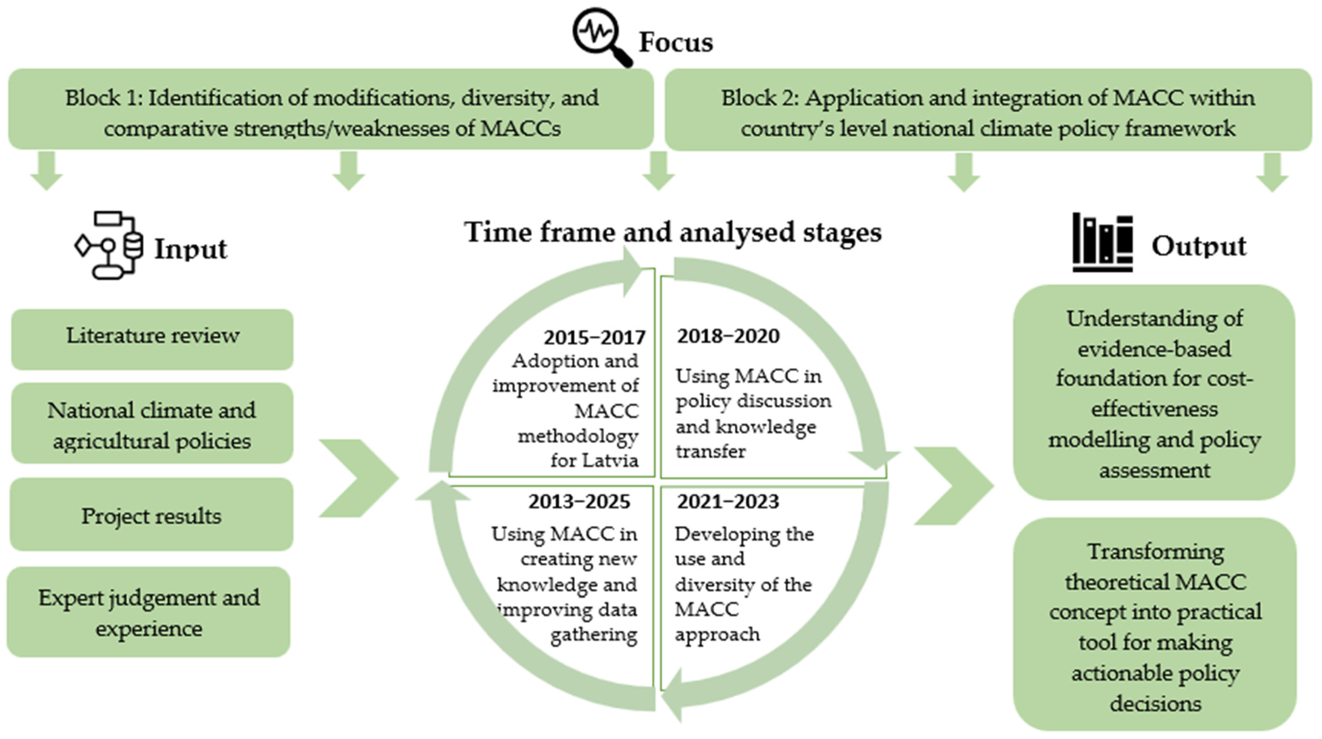 | Block 2: MACC case study application | Expert judgement and experience from previously conducted projects | Utilize project results from Latvian climate policy initiatives | Focus on how MACCs are integrated and applied within Latvia’s national climate policy frameworks for actionable insights | Transforms theoretical MACC concepts into actionable policy decisions |