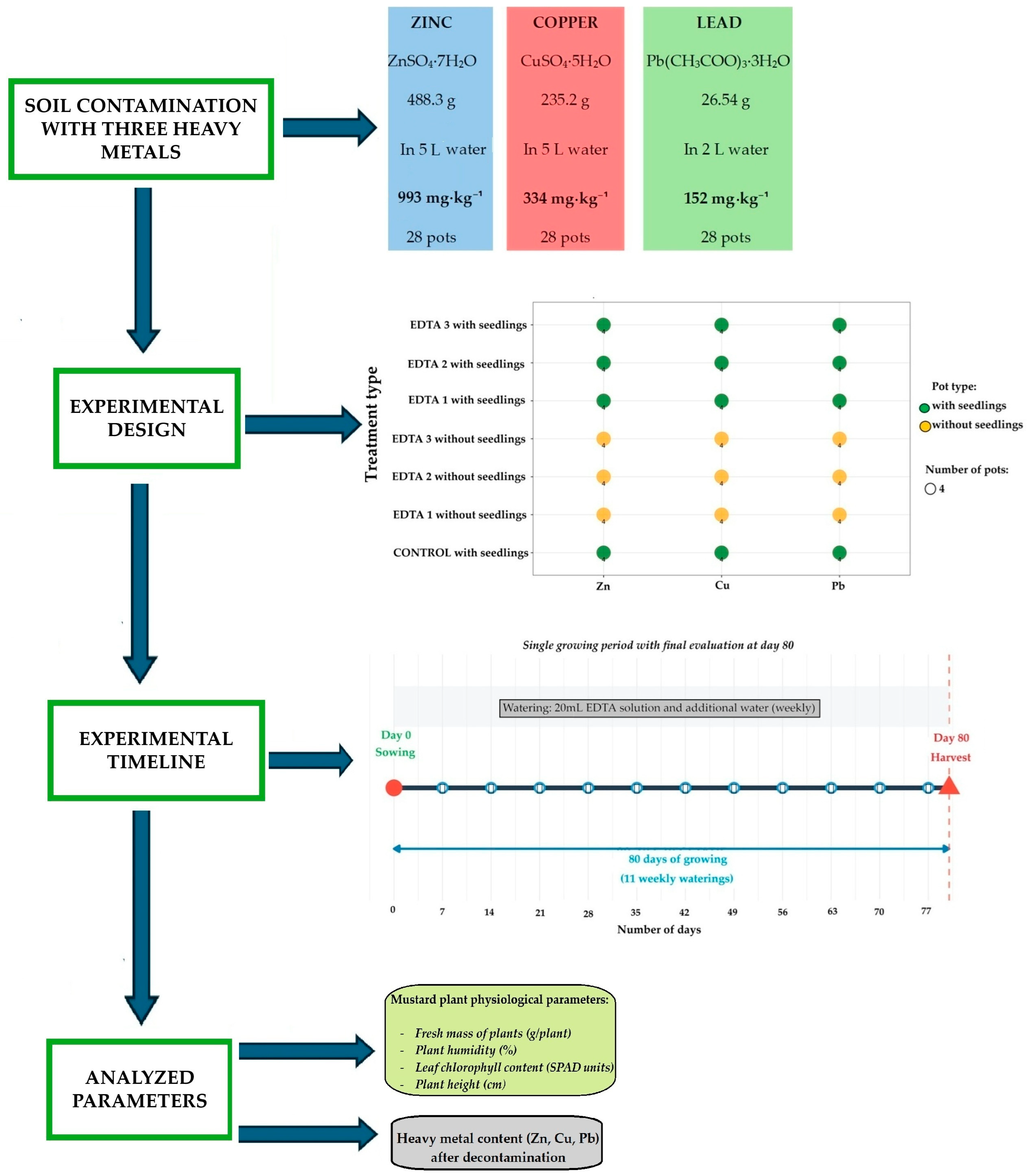 The choice of EDTA among other chelating agents (EDDS, DTPA, HEDTA, citric acid) was based on the literature [34,35,36,37], which highlights its ability to mobilize metal ions, prevent heavy metal precipitation and solubilize metals adsorbed in the solid fractions of the soil. The results of other studies [38,39,40,41] substantiated the use of the mixed method (Indian mustard and EDTA) as an effective strategy for accelerated decontamination of soils contaminated with heavy metals.