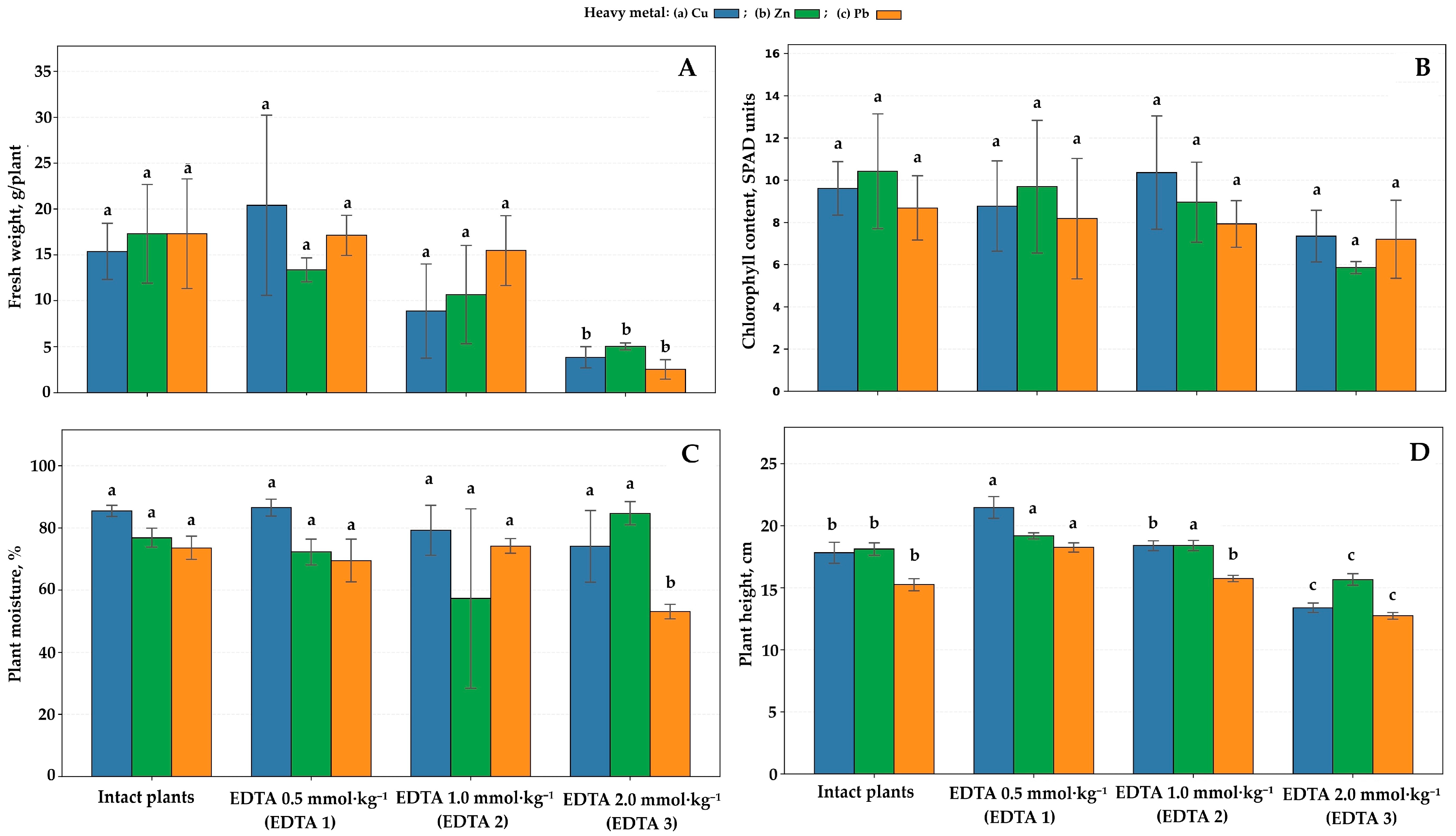 In order to maintain optimal soil moisture and prevent water stress, the total volume of liquid applied to each pot was supplemented, when necessary, with additional water. During the experiment, approximately 220–350 mL of water/pot/week was additionally added, depending on the water requirements of the plants. In this way, the EDTA:water ratio (1:4) was strictly maintained in the applied solution, while the total amount of water was adjusted to maintain uniform soil moisture.