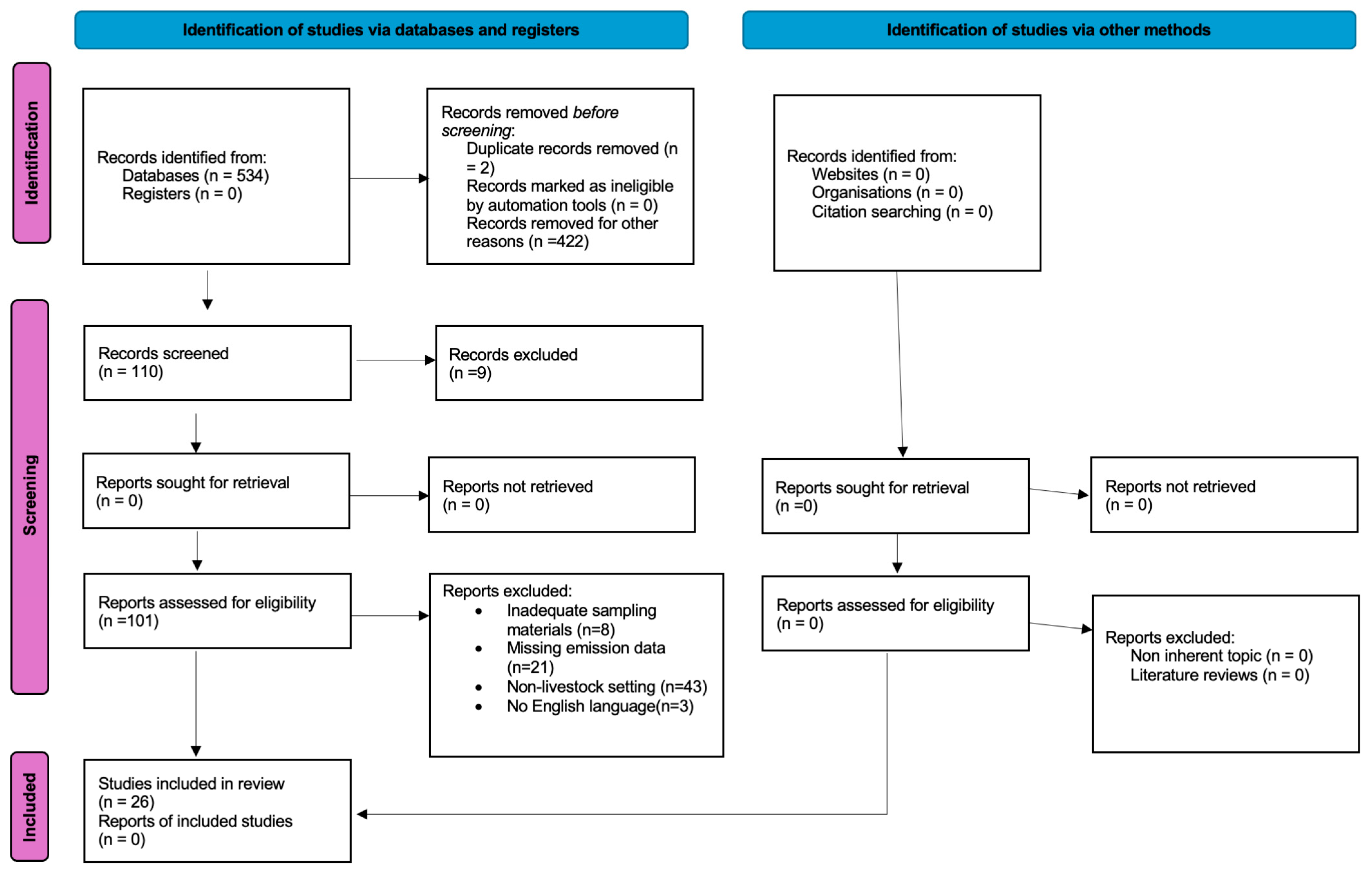 | 26. Li et al., 2024 [40] | -NH3 concentration (mg h−1 cow −1) Average: 3113.4 -PM2.5 concentration (mg h−1 cow −1) Average: 54.2 |