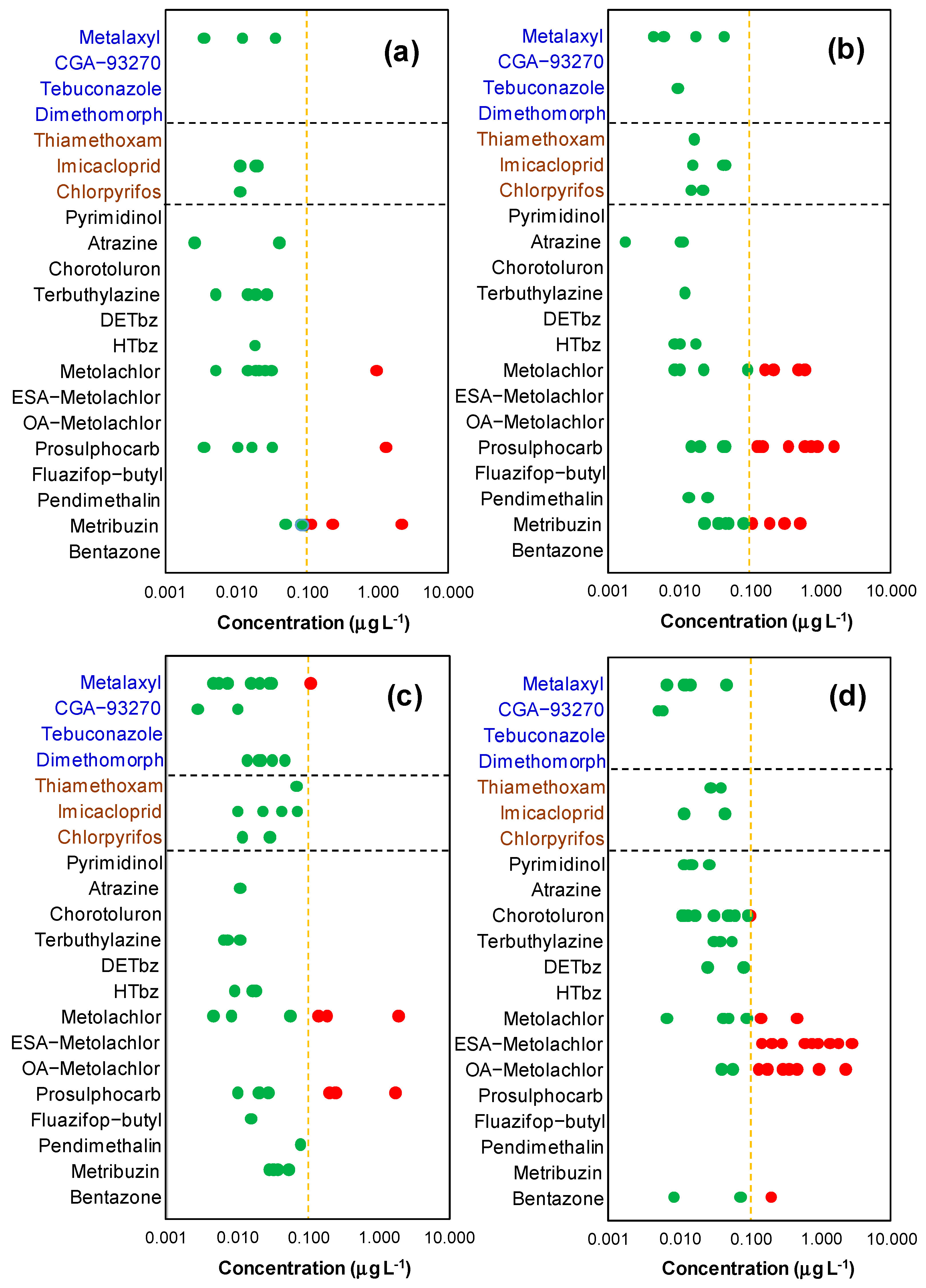 | Atrazine | 3 | - | <LOQ | - | 3 | - | <LOQ | - | 1 | - | <LOQ | - | - | - | - | - |