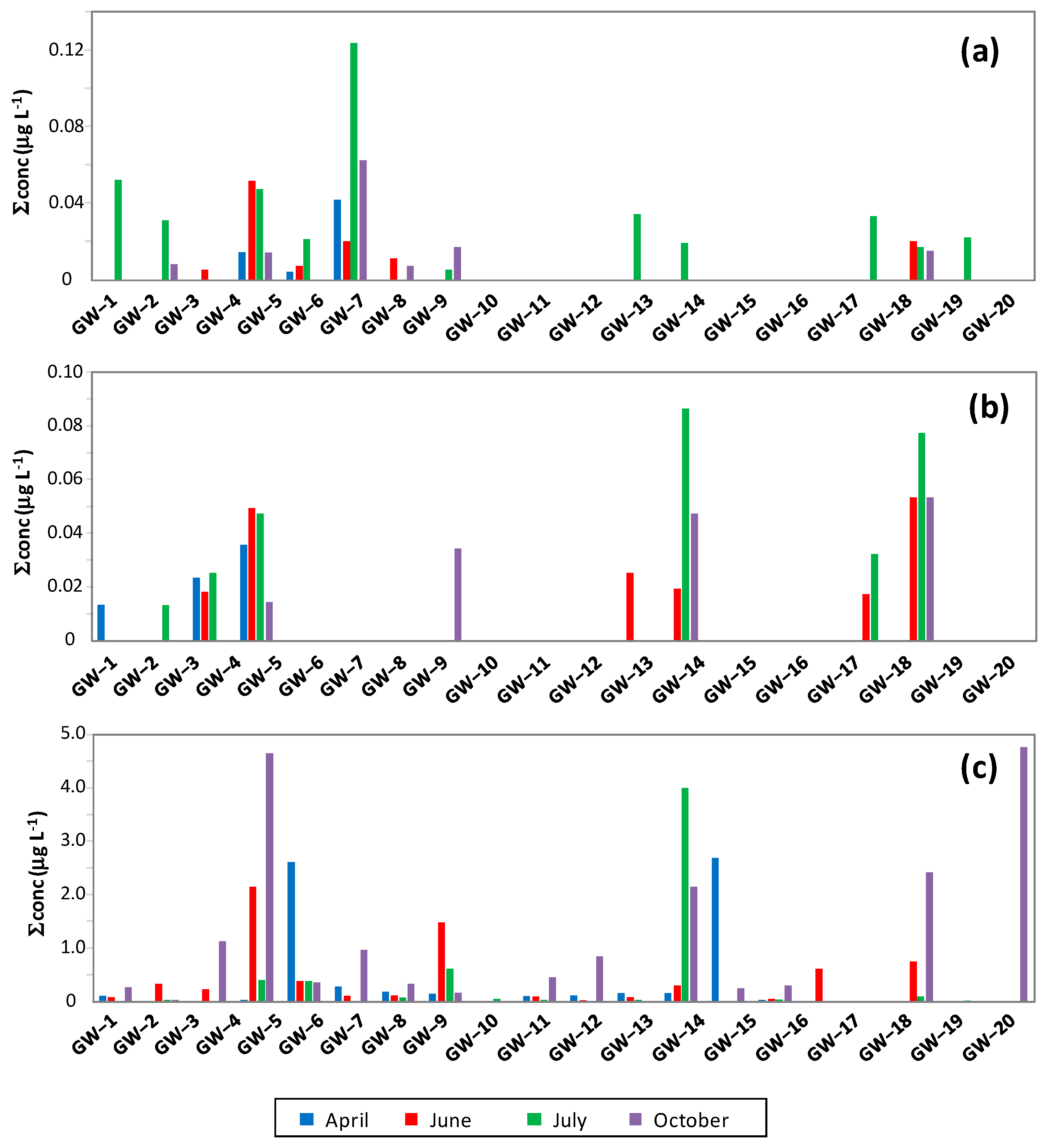| GW-13 | 0.0040 | - | - | 0.0023 | 0.0003 | 0.0002 | 0.0157 | 0.0038 | 0.0028 | 0.0008 | 0.0001 | 0.0002 |