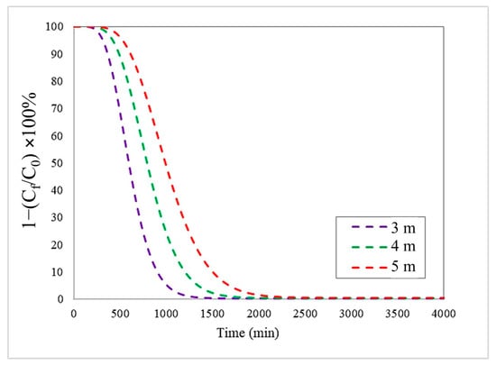 Breakthrough curves at different bed heights with an inlet flow rate and initial Pb(II) concentration of 200 m3/day and 1000 mg/L, respectively, using the Langmuir–LDF model.