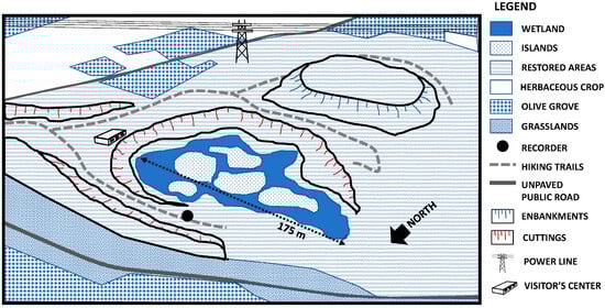 Oblique drawing of La Chanta wetland with relevant features (unscaled). The figure offers an illustration of the main forms of cultivation in the wetland surrounding terrains (herbaceous crops and olive groves mainly) and the relative location of the main sources of anthropogenic noise (unpaved rural roads) and a high-voltage power line. To a large extent, their effects are shielded by the excavation cuts and the plateau-like embankment. The black dot represents the location of the audio recorder during acoustic monitoring of the wetland soundscape.