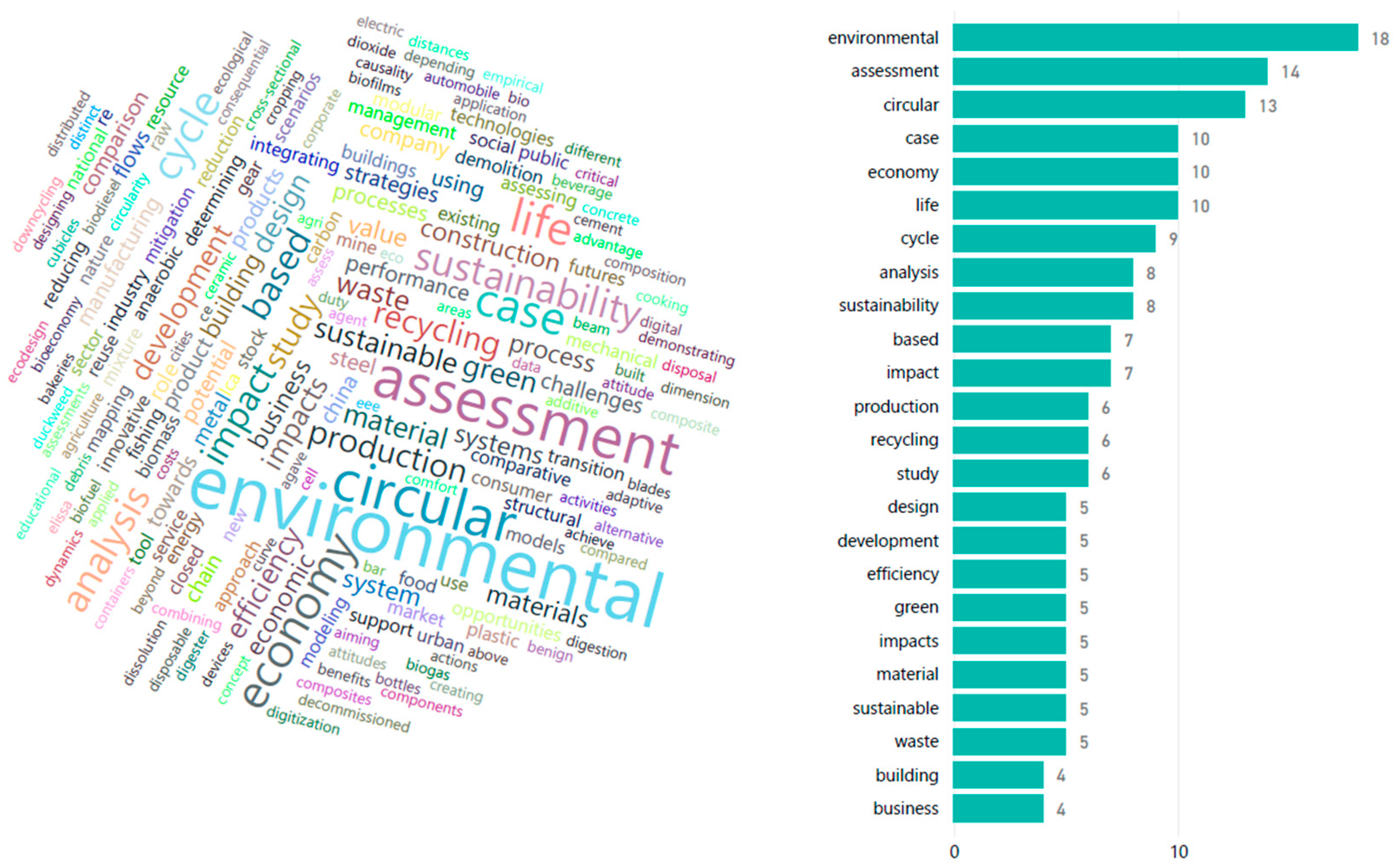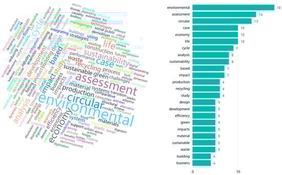 The lexical analysis of publication titles (RQ1) confirms these thematic patterns and reveals methodological ones. “Environmental” is the most repeated word (18 times, 29% of the corpus), followed by “evaluation” (14 times, 23%) and “circular” (13 times, 21%). The semantic dispersion reaffirms the field’s vocation towards environmental impact assessment, rather than towards the economic-social dimensions of circularity. The high frequency of “assessment”, “case” and “life” (each 10 times, 16%) suggests methodological preferences for empirical case study research using life cycle assessment frameworks. This pattern indicates a progression from early conceptual and theoretical contributions to applied and evidence-based research on circular economy implementation and environmental performance (