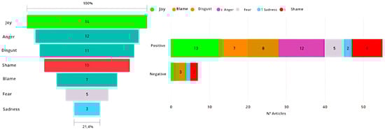 Fear (8 articles, 13%), guilt (9 articles, 15%) and sadness (7 articles, 11%) are other elements that enrich this emotional perspective, indicating that the circular economy is making use of broader environmental communication strategies that draw on affective appeals to engage its readers and stakeholders. The hegemony of positive over negative valence (58% positive vs. 42% negative emotional content) reveals strategic optimism, perhaps because of the authors’ awareness that crisis-focused messages can generate fatalism rather than engagement. This emotional architecture makes the circular economy feel necessary but possible, blending recognition of the problem with the solution.