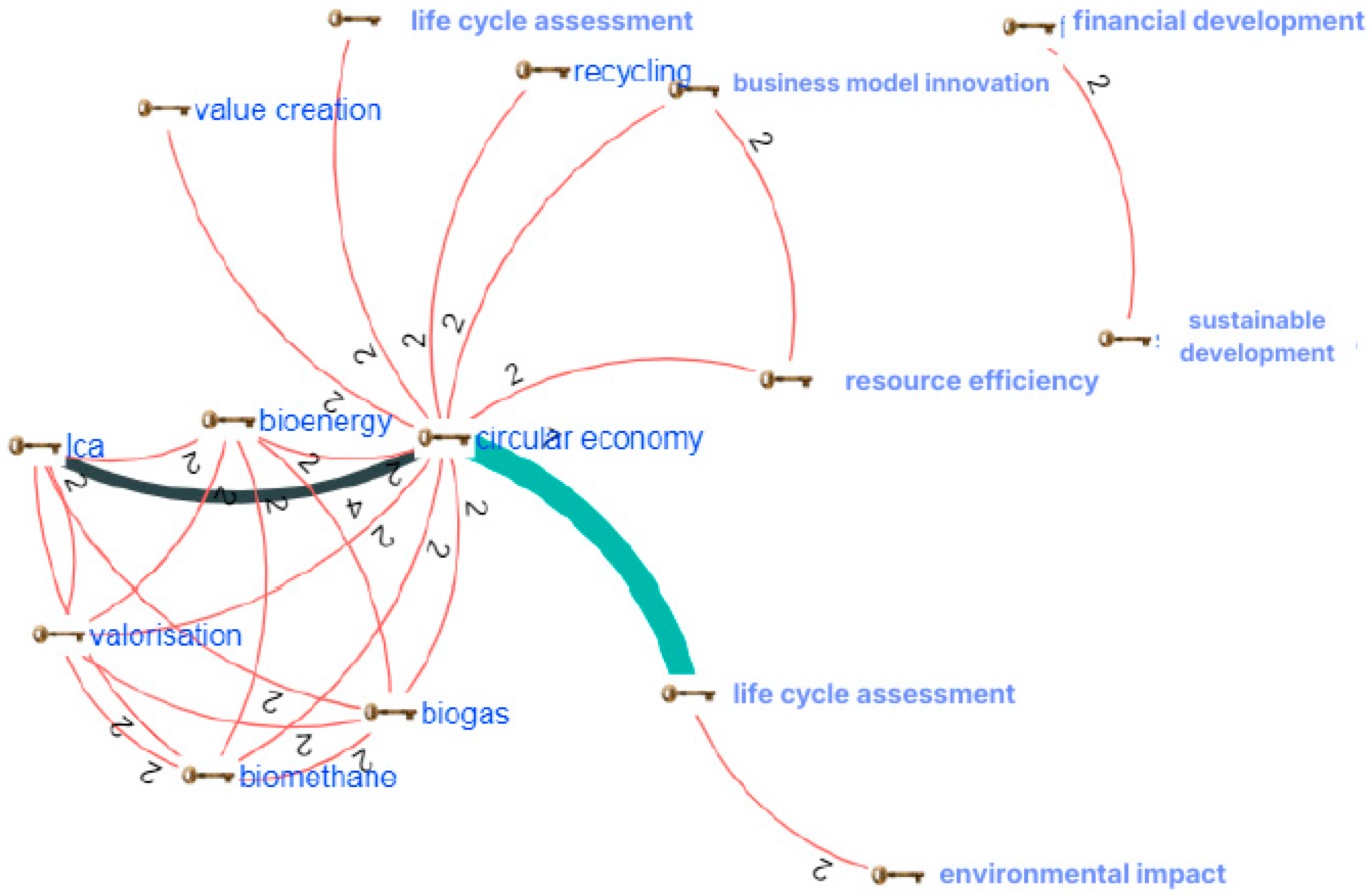 The second major thematic cluster brings together words such as “bio-energy”, “biogas”, “biomethane” or “valorization”, which account for 23% of the total keyword network. The clustering shows the research interest in valorizing organic waste and generating renewable energy as the main ways to develop the circular economy. The connection between these terms reflects academic recognition that waste-to-energy pathways meet multiple sustainability objectives: closing material cycles, decreasing reliance on landfills, displacing fossil fuel use, and creating economic value from waste streams.