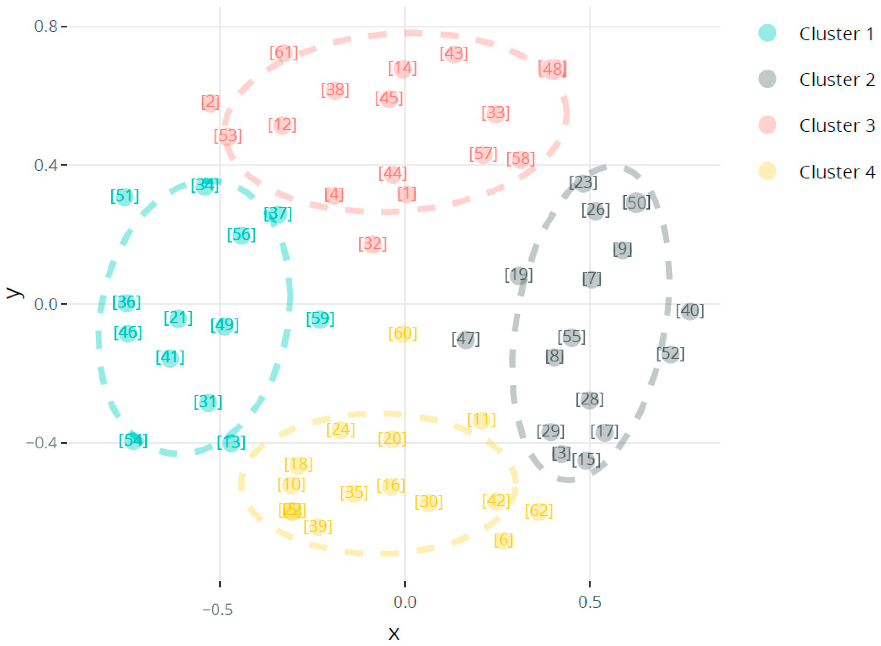 Hierarchical clustering analysis based on title similarity shows a large thematic overlap and the emergence of cohesive research streams (RQ5). Among the 62 articles, 36 pairs of articles had similarity scores greater than 0.44, revealing shared conceptual frameworks, methodological approaches, or application domains. The highest similarity scores—0.77 for the pair of references [