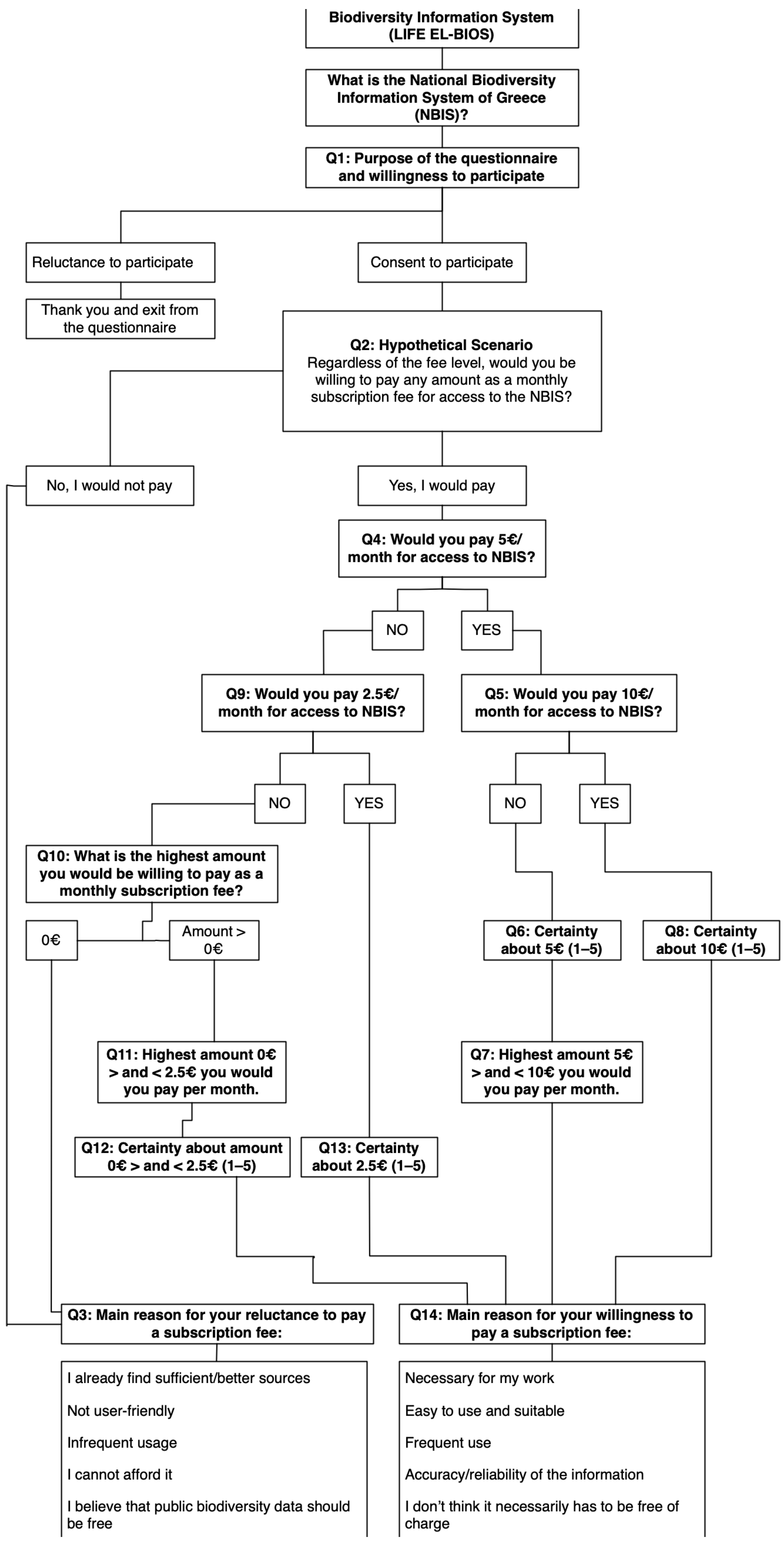 - General willingness-to-pay (Yes/No): asked prior to the valuation section; a negative response directed the respondent to a follow-up question identifying the reason for unwillingness (protest/economic/usage/quality/usability, with an “Other” option), after which the survey closed.