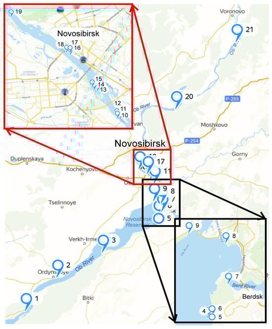 Freshwater samples were collected in August 2023 from 21 stations with varying anthropogenic influences along the Ob River and its tributary, the Berd River, near the cities of Novosibirsk and Berdsk, Russia (Figure 1, coordinates are given in the Table S1). Sampling sites were selected to represent different potential sources of MPs pollution and included: ferry crossings (stations 1–2), recreation centers and beaches (stations 3, 7–9), storm sewer outlets (stations 10–12, 16–18), industrial wastewater discharge stations (stations 4–6), the mouths of small rivers (stations 13–15, 19), and areas near rural settlements (stations 20–21).