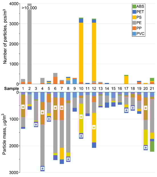 Particle count (μ-FTIR) and approximate MPs mass (pyro-GC-MS). The * symbol denotes polymers above the limit of quantification (LOQ).