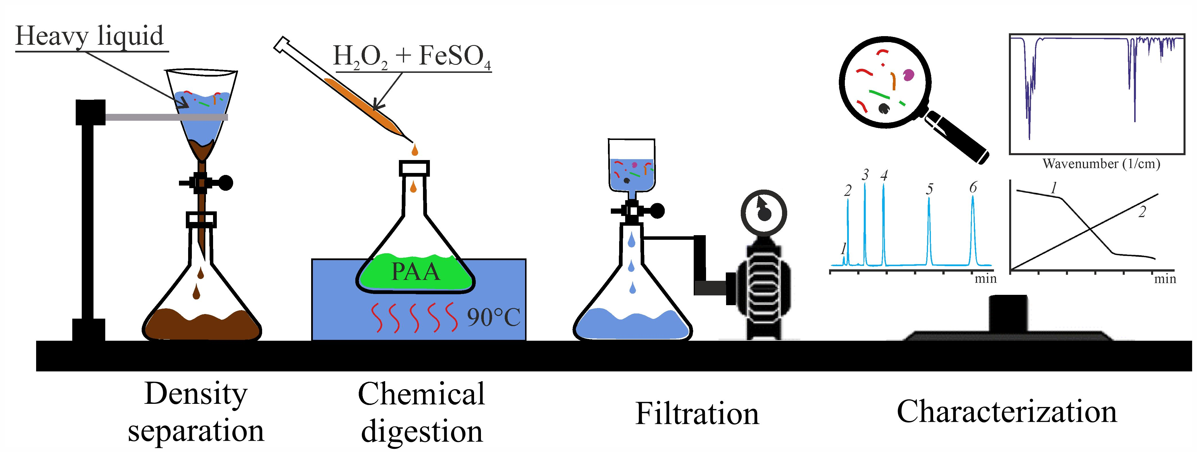 1.7–1.8 g/mL ZnCl2 solution; 10% SDS, 50 °C, 3 days; 30% H2O2, 37 °C, 2 days; 10 M HNO3, 20 °C, 1 day | 193–2072 (CFC); 269–574 (HC); up to 39,458 (glass bottles) | 0.01–5.00 | - | Optical microscopy; ATR-FTIR; FPA-FTIR imaging; Raman imaging | [25] |