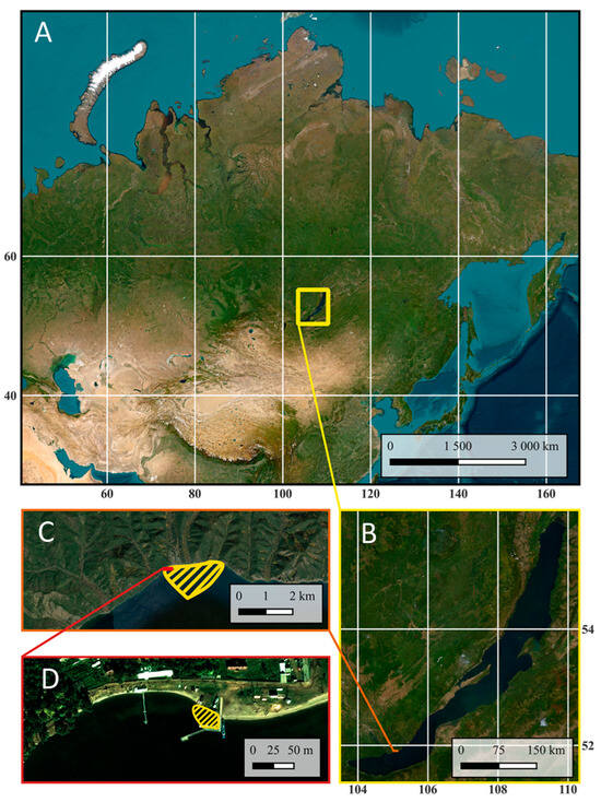 Location of Lake Baikal and Bolshie Koty Bay: (A)—general plan, (B)—Lake Baikal, (C)—Bolshie Koty Bay (the study area is highlighted with shading), (D)—pier and ship mooring area in Bolshie Koty Bay (the study area is highlighted with shading) (an ESRI satellite was used as a baseline).