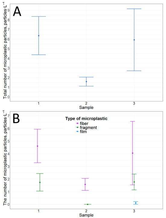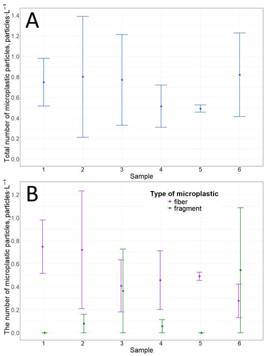 Ice sample analysis showed that the total number of microplastic particles at any distance from the shore in this study did not differ statistically (p-value = 0.9) (Figure 4). The number of microplastic particles ranged from 0.5 ± 0.04 to 0.8 ± 0.6 particles·L−1 (Table 3). Only two types of particles were detected in the samples: fibers and fragments. Moreover, in most cases, fibers were the predominant type of microplastic particle (based on average values) in terms of morphological structure (Figure 4). It is worth noting that there are no statistically significant differences between the number of fibers and fragments at each point (Table 4). Overall, the analysis confirms our previous preliminary data on microplastic particles from the underside of ice [28]. The available data lead us to believe that microplastic particles are most likely brought into Bolshie Koty Bay by gyre currents (which are present in Lake Baikal), which in turn are transported from the waters of the Selenga River.