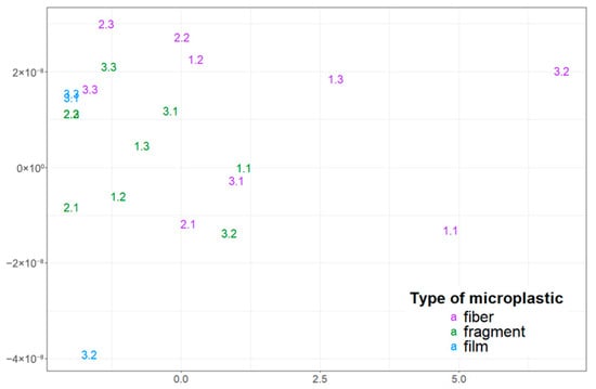Visualization of the distribution of microplastic particles with different morphological structures in snow cover using multidimensional scaling (the first digit corresponds to the sampling point number, and the second digit indicates the sample number).