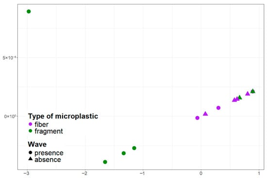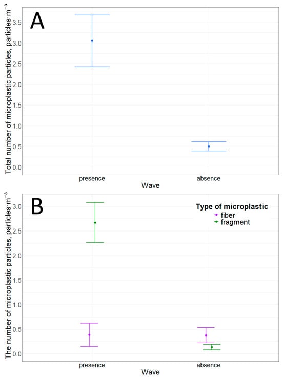 Microplastic fibers and fragments were detected at this location. Furthermore, stormy weather significantly increases the concentration of microplastic particles in the water (Table 10). The total particle concentration increases sixfold. This increase is due to the increased concentration of microplastic fragments. Wave activity increases the concentration of microplastic fragments by more than 20 times (Table 10, Figure 5 and Figure 6).