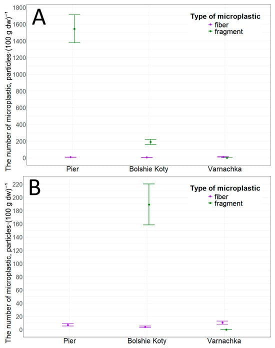 We also collected sediment samples at this location. Data analysis revealed that the concentration of microplastic particles in sediments at this site was 1550.9 ± 168.0 particles·(100 g dw)−1 (min—1238.0, max—1813.5). This concentration was primarily composed of fragments—1543.7 ± 167.4 particles·(100 g dw)−1 (min—1230.8, max—1803.1). Fibers account for a minority of particles—7.2 ± 1.8 particles·(100 g dw)−1 (min—4.1, max—10.4). The obtained values of microplastic particle concentration significantly exceed the values obtained in this study for other locations (Figure 7). However, statistically significant differences were found only between particle concentrations in the pier area and the Varnachka area (p-value = 0.01, r = 0.62).