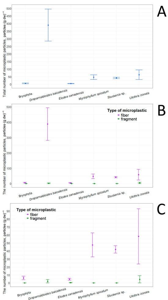 The lowest total number of adsorbed microplastic particles was found in E. canadensis (5.1 ± 1.4 particles·(g dw)−1), while the highest was found in D. baicalensis (390.4 ± 105.3) (Table 12). The number of adsorbed particles in Bryophyta was close to that in E. canadensis. In contrast, Stuckenia sp. and Myriophyllum spicatum occupied an intermediate position in terms of the number of adsorbed microplastic particles, but tended overall toward E. canadensis (Figure 8). However, U. zonata and D. baicalensis showed the opposite pattern. Pairwise comparisons of the total number of adsorbed particles revealed statistically significant differences only between Bryophyta and D. baicalensis (p-value = 0.04, r = 0.62), and between D. baicalensis and E. canadensis (p-value = 0.02, r = 0.64). Examination of particle types showed that fibers predominated in all taxa (Table 12), and in some cases (Stuckenia sp., M. spicatum, Bryophyta) they were the only type. This pattern likely reflects difficulty for fragments to adhere to the macrophyte surface, especially under conditions of wave activity, and also by the fact that their overall abundance in the lake water is significantly lower. In E. canadensis, the presence of adsorbed fragments can be explained by the relatively wide leaf blades (at least when compared with other species presented in this study). The highest concentrations of both fragments and fibers were found in D. baicalensis and U. zonata. This increased adsorption capacity can be explained by the presence of mucus on the surface of these algae. It should be noted that E. canadensis does not have mucus, while D. baicalensis and U. zonata are filamentous algae. It is worth noting that a comparison of adsorbed fibers and fragments between each taxon did not reveal statistically significant differences. Pairwise comparison of the number of adsorbed fragments between taxa also revealed no differences, and pairwise analysis of the number of fibers revealed differences only between D. baicalensis and E. canadensis (p-value = 0.01, r = 0.62).