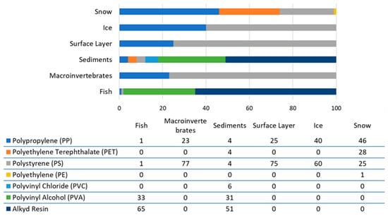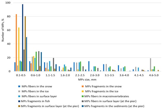 Regarding the impact of microplastics on living organisms, at present, a considerable amount of periodically contradictory and ambiguous information exists. This can be interpreted as the fact that the impact of plastic particles depends on their morphological shape, size, type of polymer and is species-specific [5,6,20,21]. To date, microplastics have been detected in natural environments in many organisms, from zooplankton to aquatic mammals [10,19], with most research still focusing on marine organisms [4,22]. Microplastic particles are transferred through the food chain [10,16,18,19], with organisms at higher levels consequently harboring higher numbers of particles. Moreover, in the same ecosystems, for example, bottom-dwelling fish are found to have a greater number of particles than pelagic fish [23], which confirms that plastics tend to accumulate in bottom sediments and enter the food web.