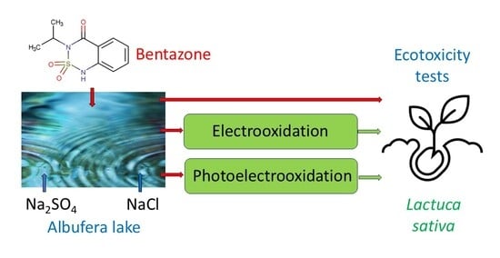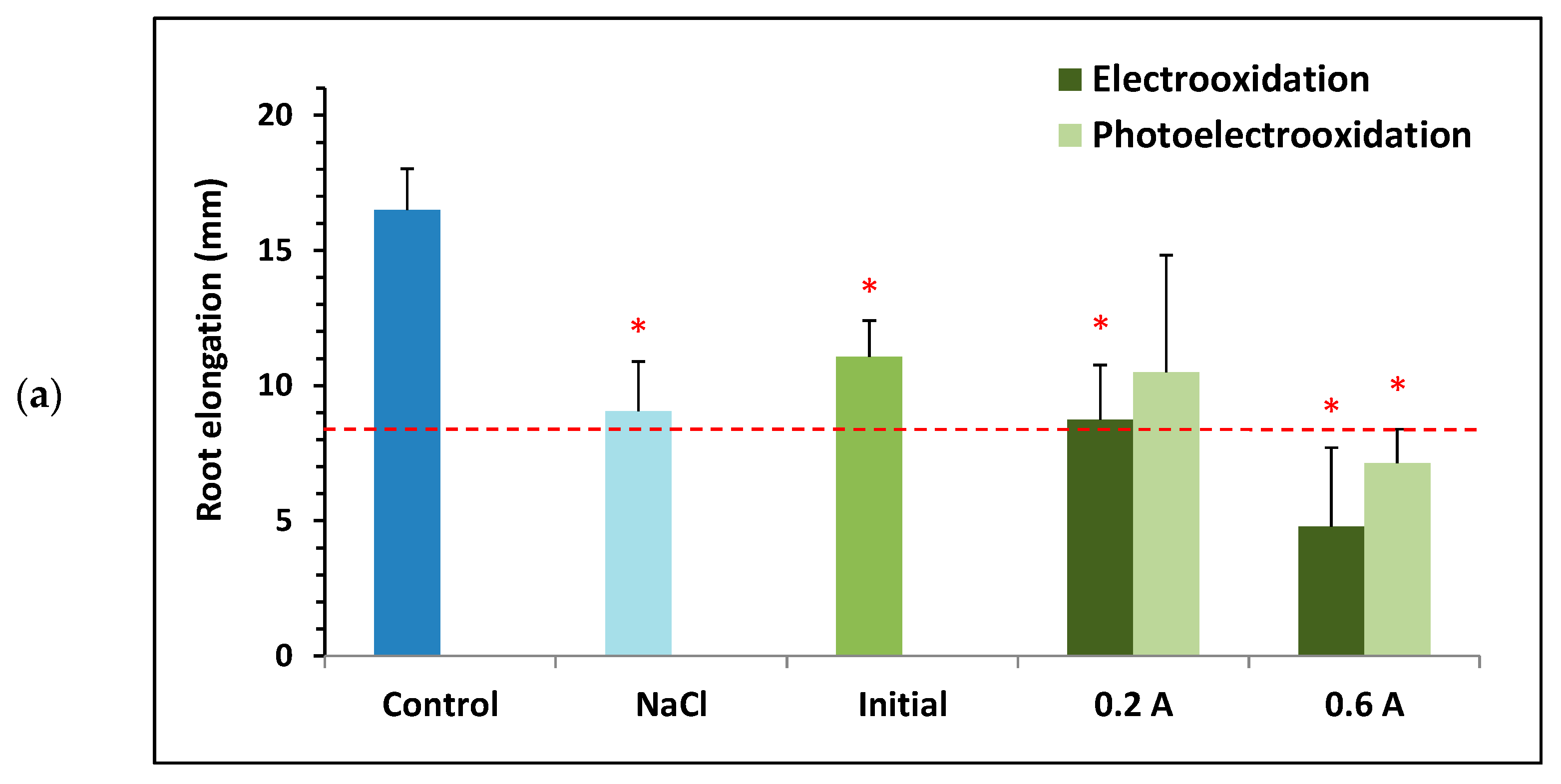 Lactuca sativa. Furthermore, in general, applying 0.6 A leads to a higher final toxicity than applying 0.2 A; and with the electrooxidation process, the final toxicity is higher than with the photoelectrooxidation process.