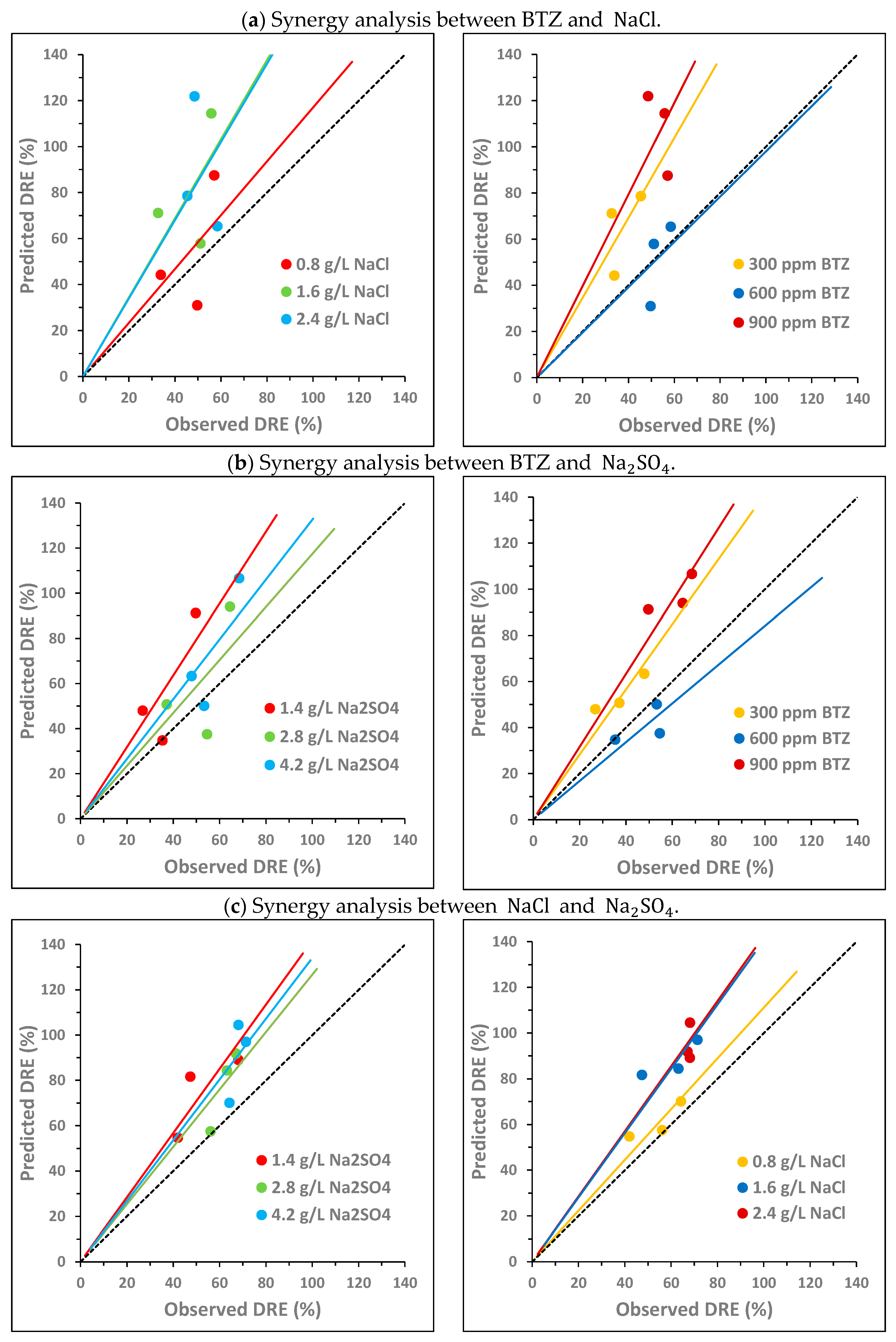 Figure 3a (left), it is observed that, as the NaCl concentration increases, the points move further away from the bisector, increasing the antagonistic effect between both compounds. In