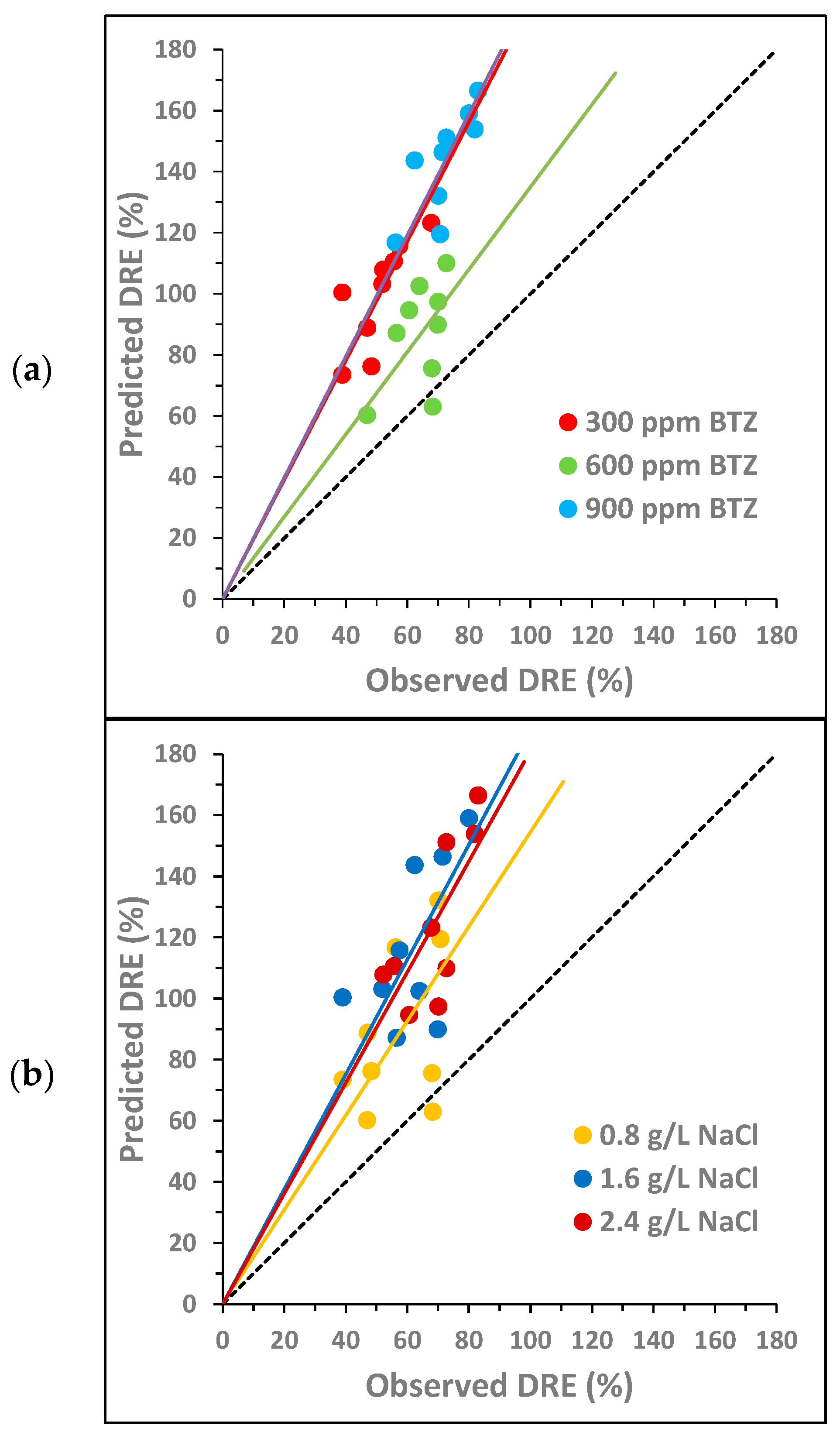 3.1. BTZ, NaCl, and Na2SO4 Individual Ecotoxicity Towards Lactuca sativa