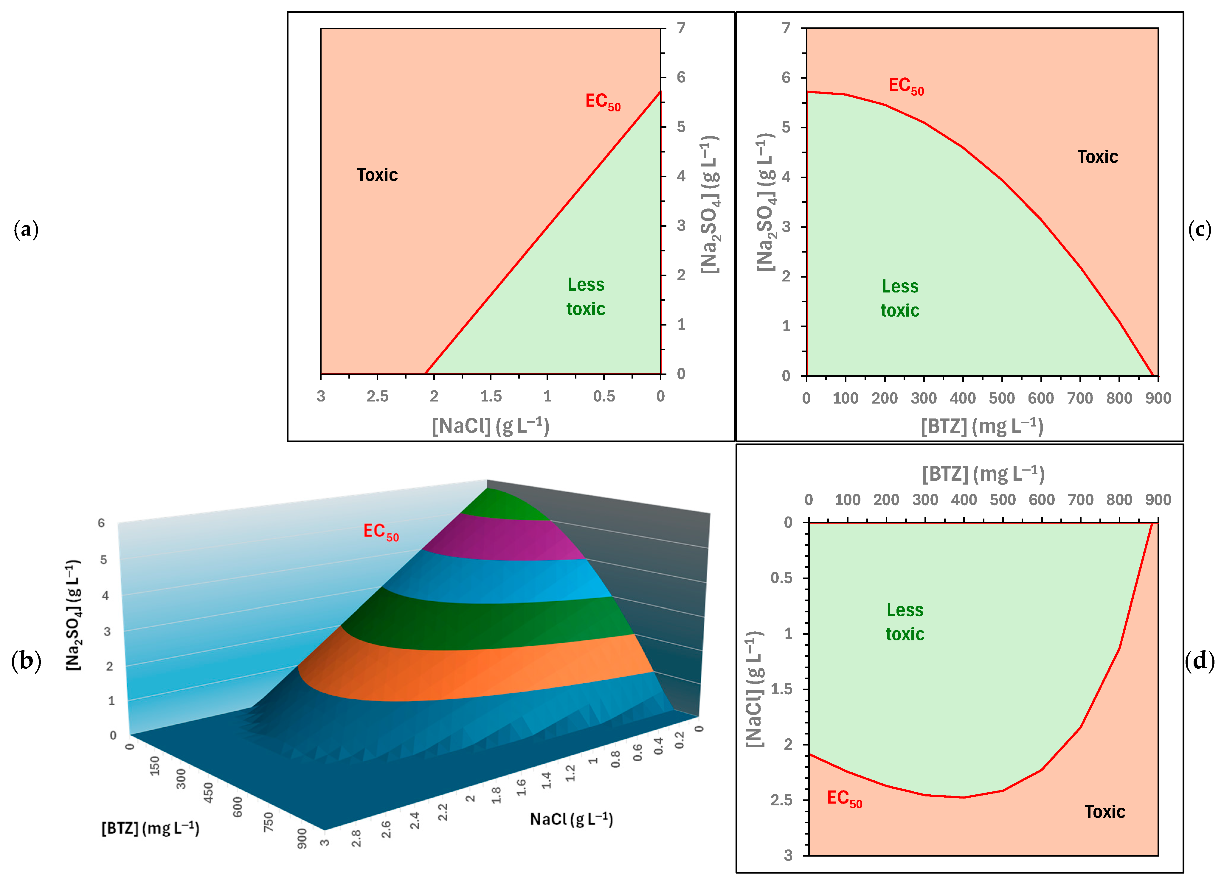 Figure 6a) is not a plane, but a surface of greater complexity, as expected from its intersections with the Cartesian planes. In general, it is observed that the progressive increase in the concentrations of the three substances leads to an increase in the ecotoxicity of the system. Regarding the inflection point detected for BTZ combined with