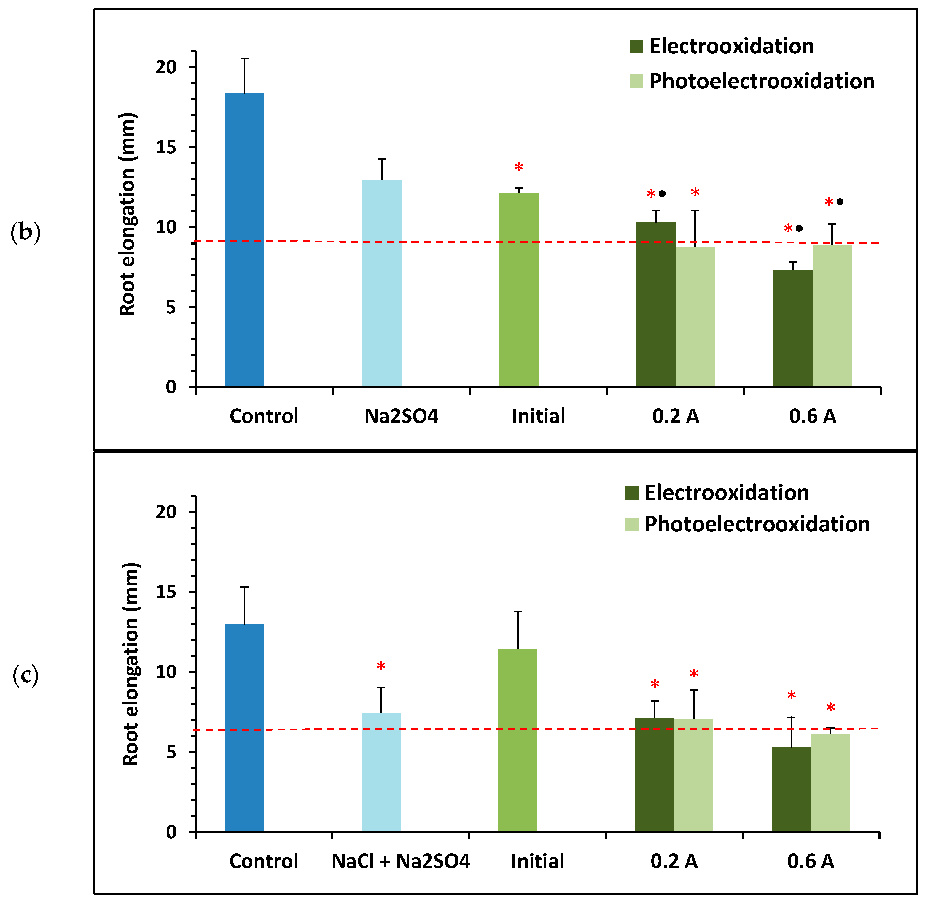 In summary, as observed using as the supporting electrolyte, the results obtained with suggest that electrochemical treatments at 0.6 A generally provide more toxic final effluents than applying 0.2 A. Moreover, the use of ultraviolet light in the process may have a mitigating effect on toxicity.