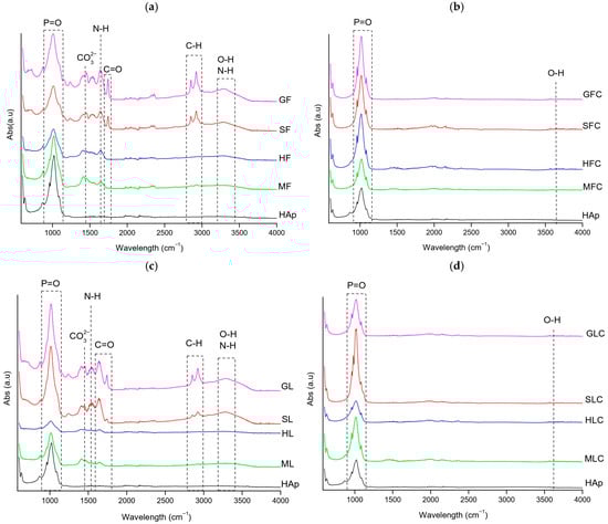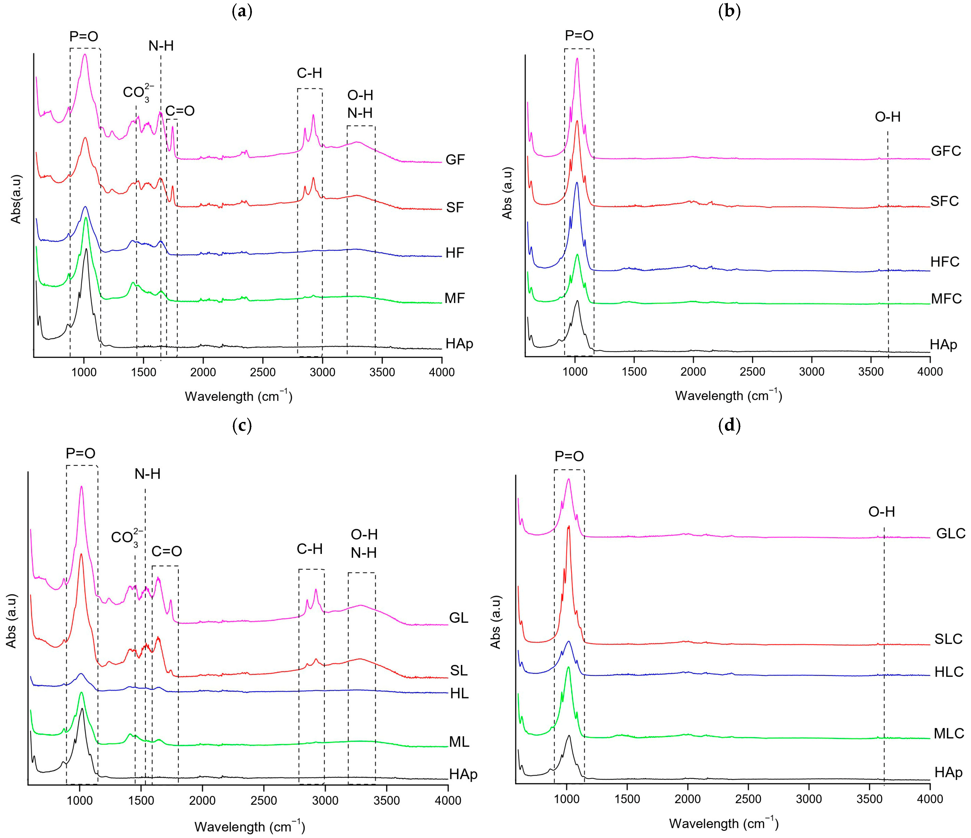 FT-IR spectra of the clean fishbone samples: (a) XF, (b) XFC, (c) XL, (d) XLC.