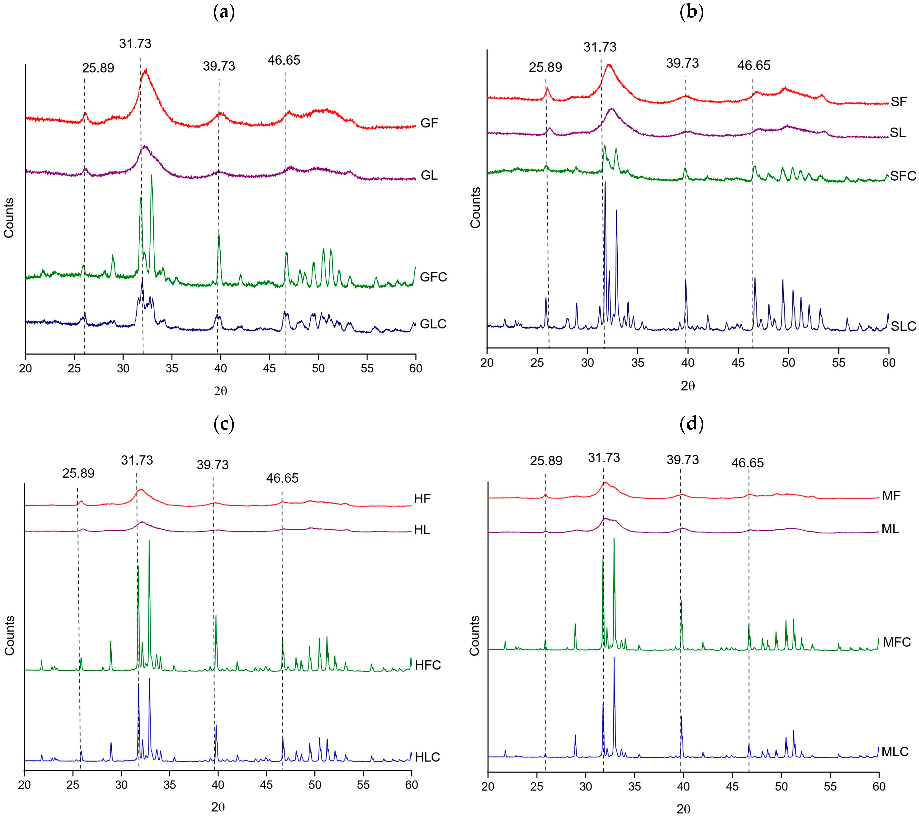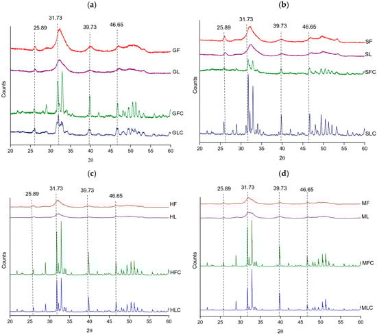 XRD diffractograms of the treated fishbones: (a) gilt-head bream, (b) salmon, (c) hake, and (d) megrim.
