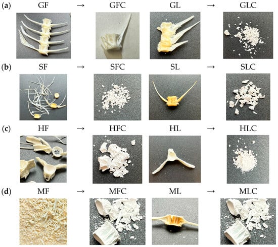 Photographs of samples before and after calcination: (a) G, (b) S, (c) H, (d) M.