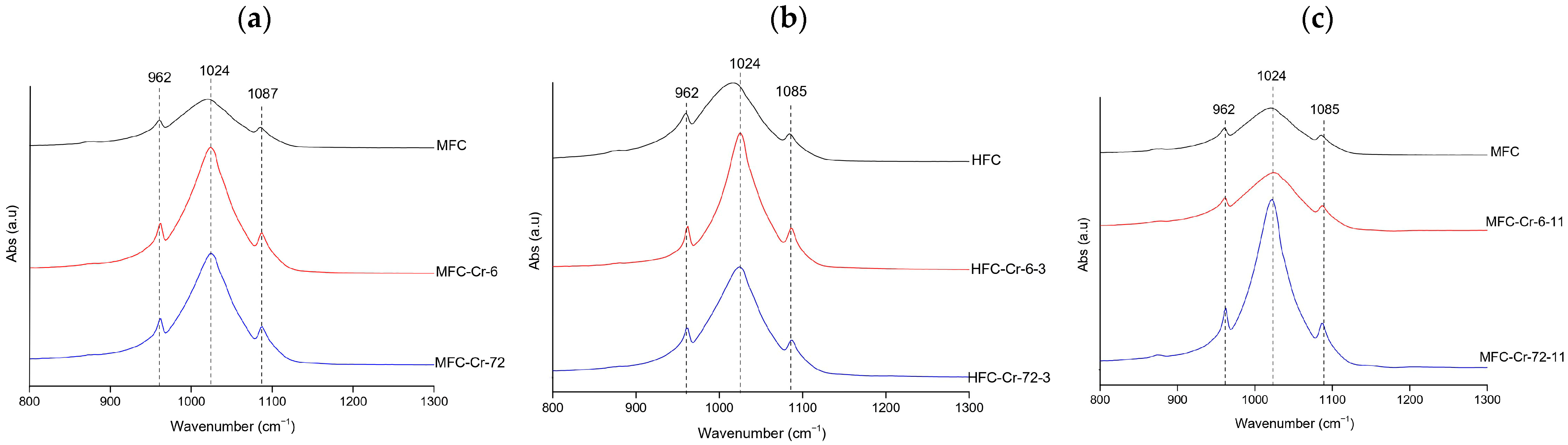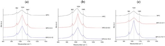 Representative FTIR spectra of Cr-treated hydroxyapatite (XFC) at (a) natural pH (megrim), (b) pH 3 (hake), and (c) pH 11 (megrim), showing the samples with the highest adsorption capacity at 6 h and 72 h of contact.