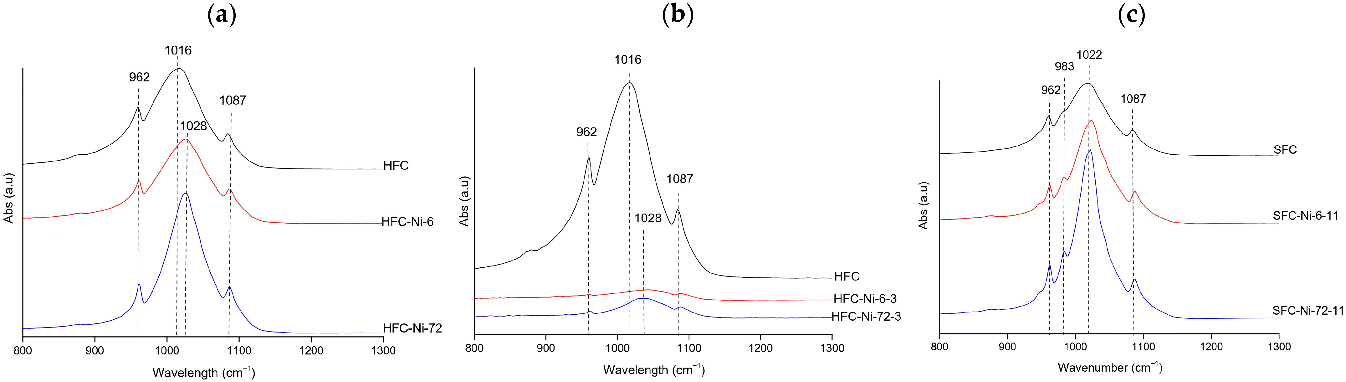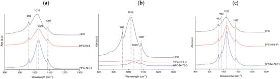 Representative FTIR spectra of Ni-treated hydroxyapatite (XFC) at (a) natural pH (hake tail), (b) pH 3 (hake tail), and (c) pH 11 (salmon), showing the samples with the highest adsorption capacity at 6 h and 72 h of contact.