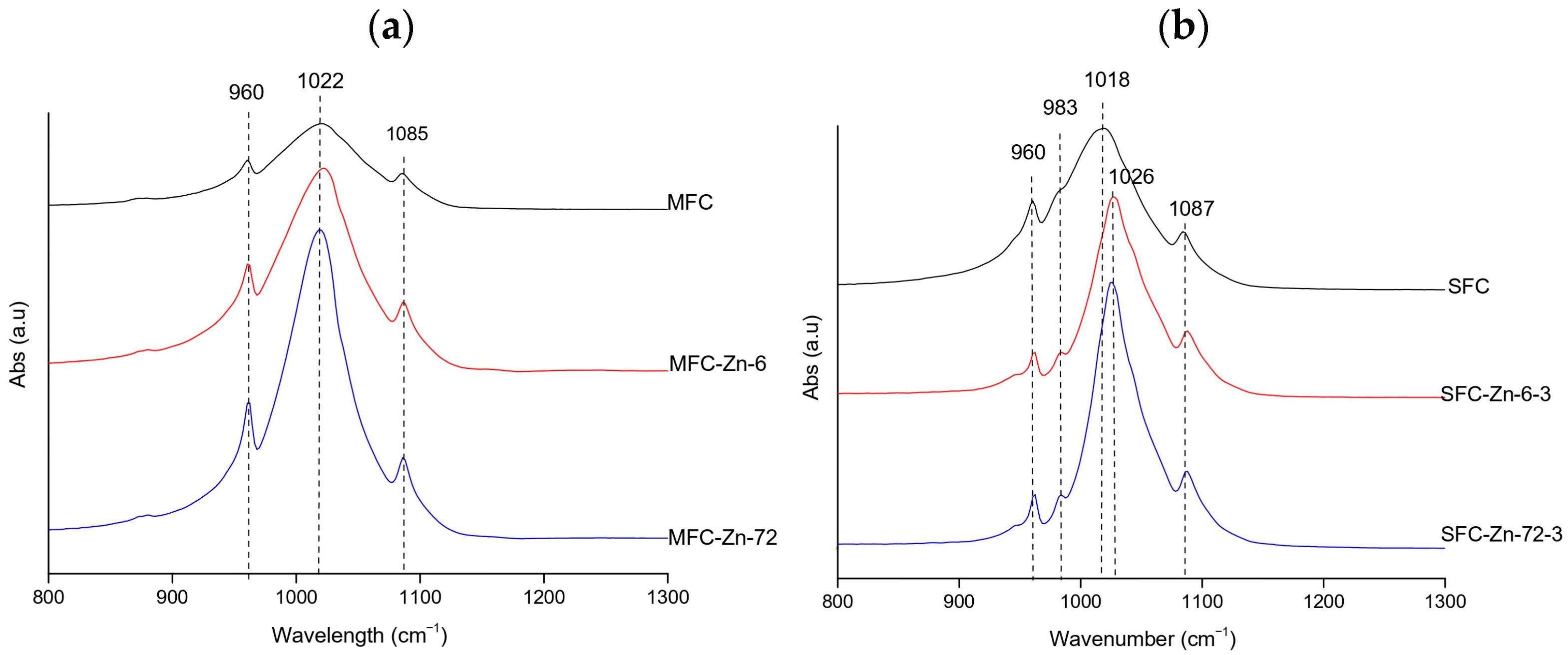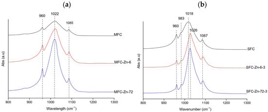 Representative FTIR spectra of Zn-treated hydroxyapatite (XFC) at (a) natural pH (megrim) and (b) pH 3 (salmon), showing the samples with the highest adsorption capacity at 6 h and 72 h of contact. No spectra were obtained at pH 11 due to precipitation phenomena.