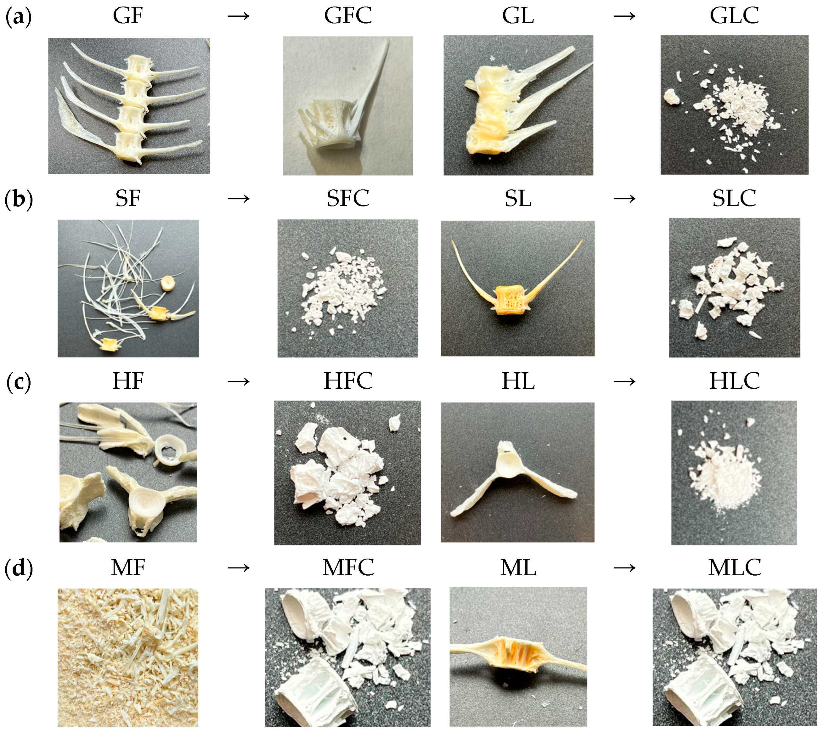 | Gilt-head bream | GF | Furnace | GFC | Furnace + Calcination |