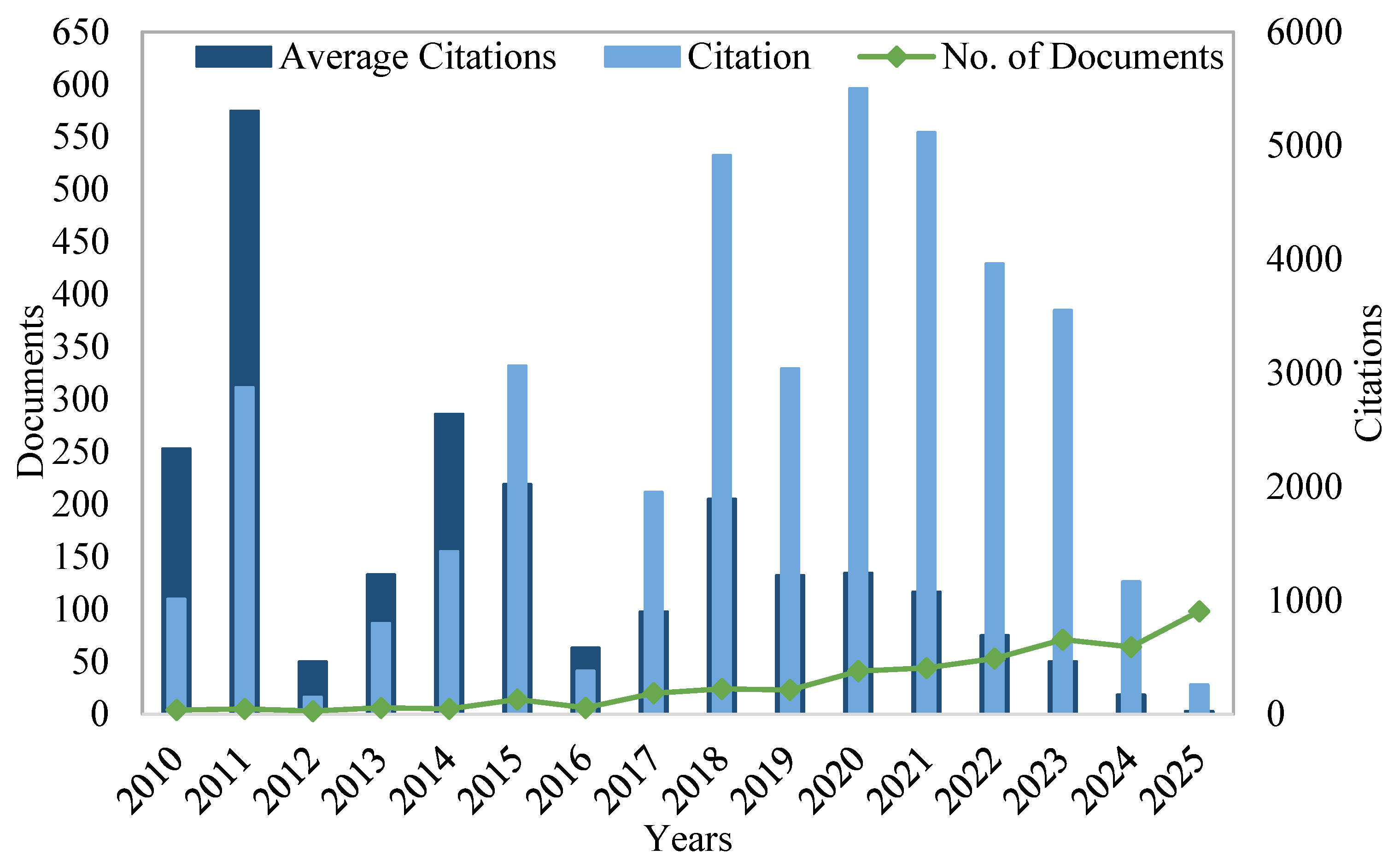 The examination of annual publication trends regarding AOPs in water and wastewater treatment from 2010 to 2025 provides insight into the evolution of research in this field. This analysis considers the number of documents published, total citations, and average citations per document, highlighting patterns of academic engagement and influence (