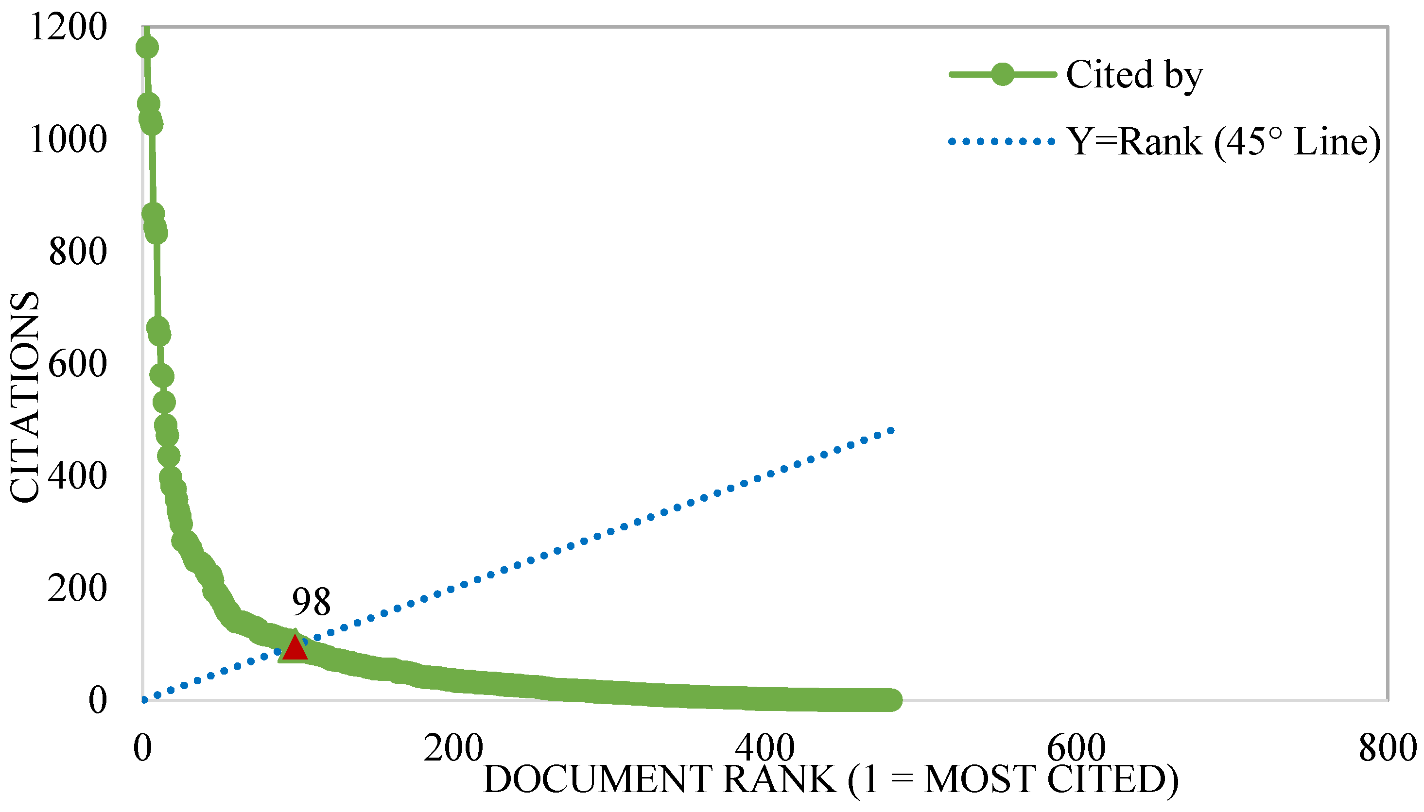 Figure 2 shows the distribution of citations among publications on AOPs in water and wastewater treatment. The horizontal axis ranks the documents from most to least cited, while the vertical axis indicates the total citations each document has received. The steep initial decline in the green curve demonstrates that a few highly cited studies have had a substantial influence on the field. The intersection of this curve with the 45-degree baseline (marked “H-index = 98”) indicates that 98 publications each received at least 98 citations, reflecting both the volume and significance of impactful research in AOPs.