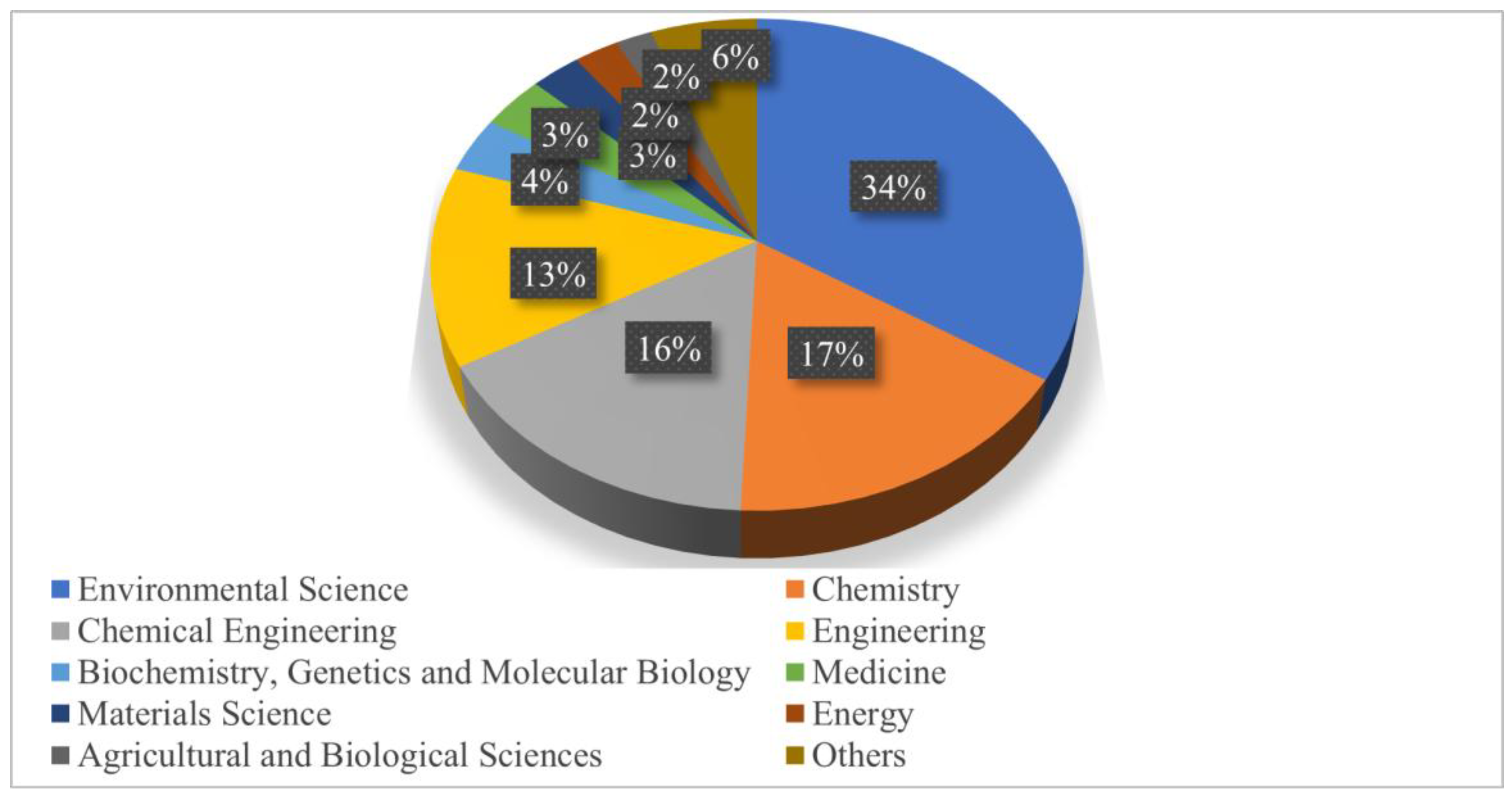 38]. Insights from this discipline are critical for developing targeted interventions that not only remove contaminants but also mitigate their adverse effects on aquatic life and human health. Lastly, the collective “Others” category—including subjects such as Materials Science, Agricultural Sciences, and various multidisciplinary fields—contributes approximately 7.1% to the overall research effort.