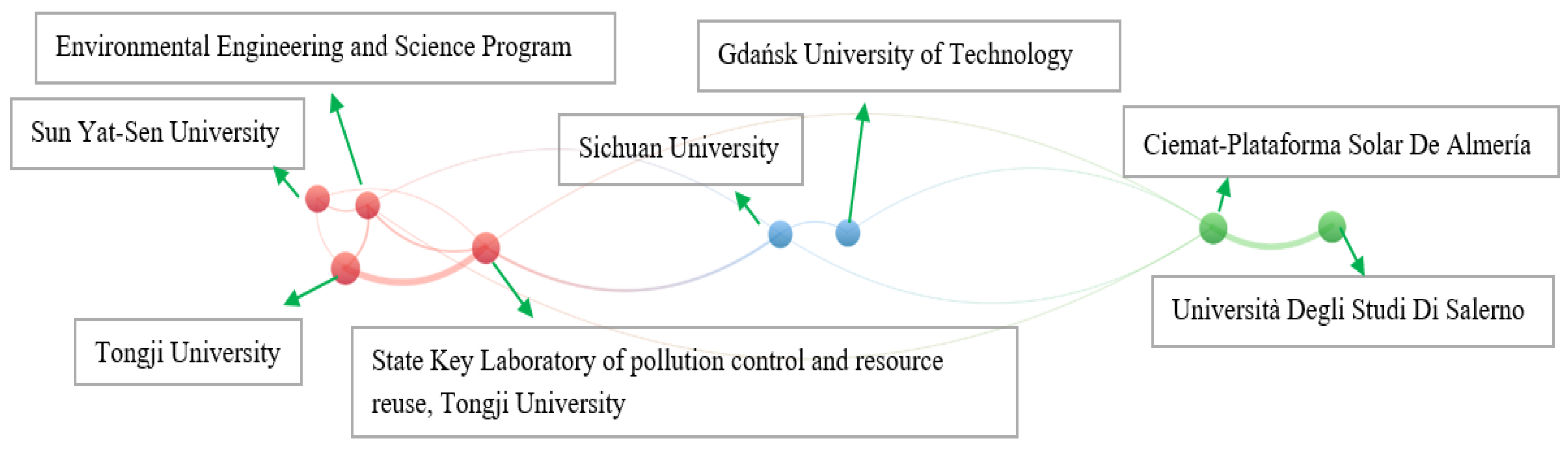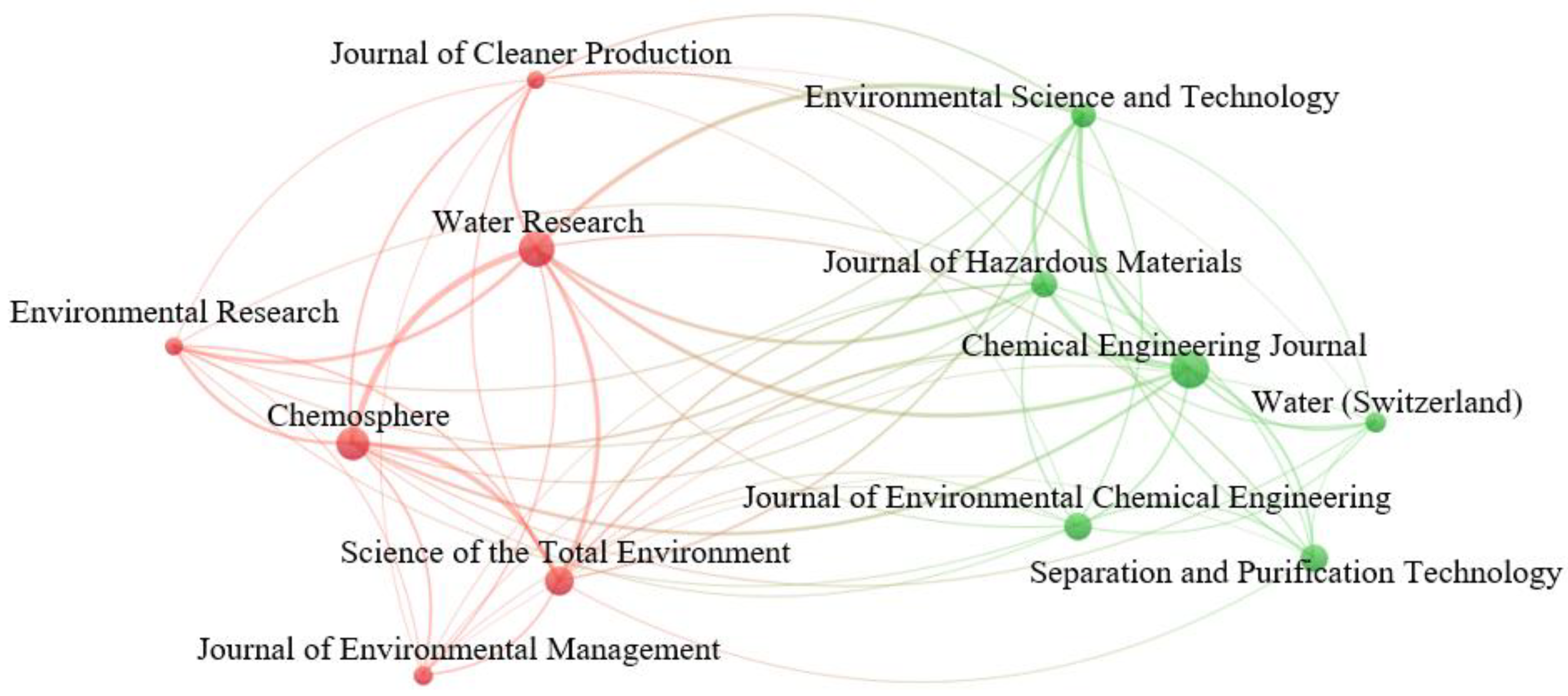 Figure 4 illustrates a co-occurrence map that depicts the relationships among journals with over 10 publications related to AOPs for water and wastewater treatment. This visualization, created using VOSviewer, effectively represents how various journals contribute to the body of knowledge in this essential field. In the diagram, each journal is shown as a labeled node, while the connecting lines indicate collaborative relationships and overlapping citations among these journals. The size of each node reflects the total number of citations received by publications from that journal, highlighting its overall influence in AOP research. Larger nodes signify journals that have produced significant research outputs and are well-regarded in the academic community. The thickness of the lines connecting the nodes represents the strength of the collaborative relationships. Thicker lines indicate a higher degree of citation overlap, suggesting that articles from these journals frequently reference each other’s work, illustrating a strong network of academic cooperation [