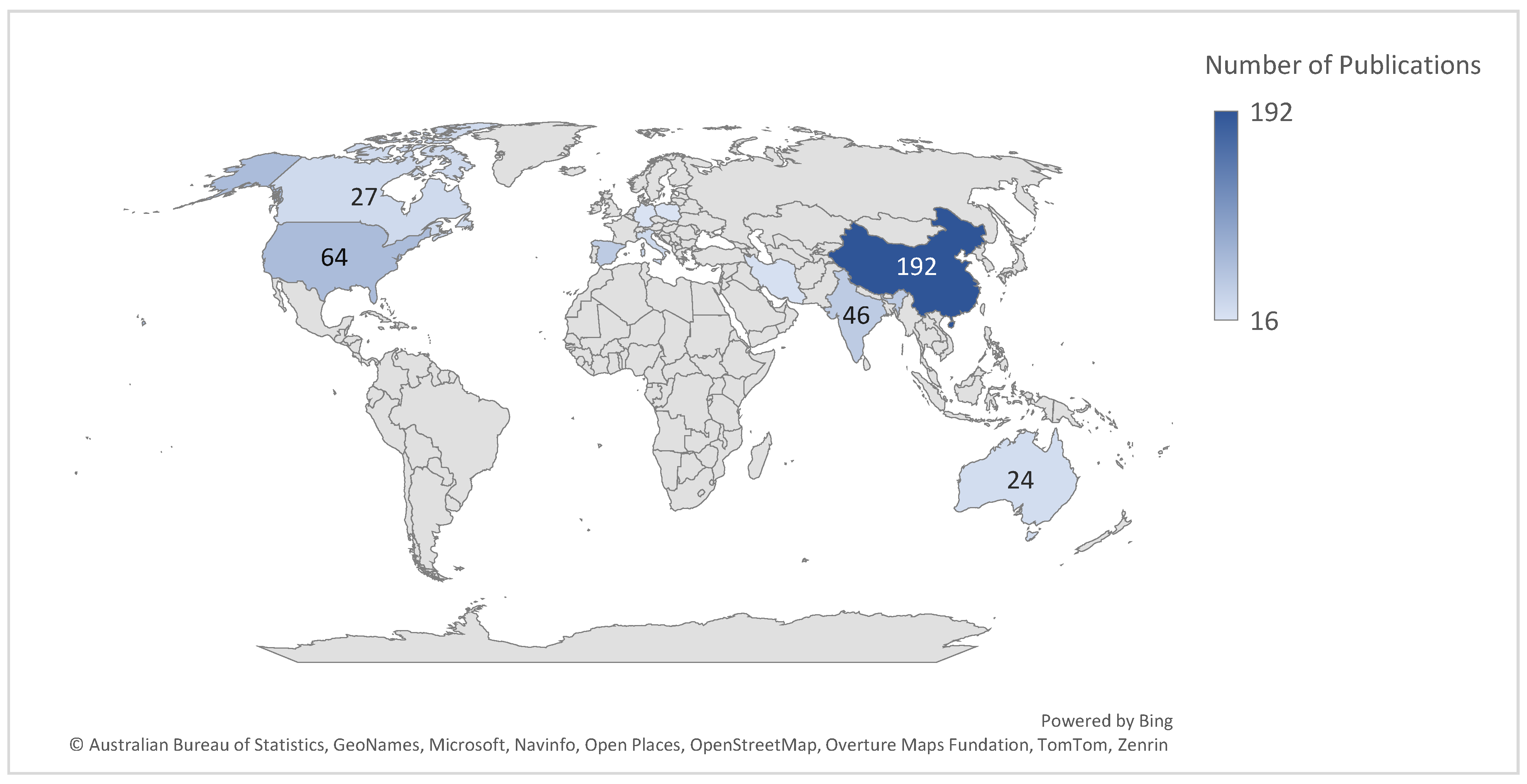 Canada’s position, with 27 publications and 2859 citations, suggests a solid, albeit modest, footprint in AOP research. This highlights an area for potential growth, as Canada is known for its rich water resources and environmental policies that could catalyze further research on AOPs. European countries, such as Italy and Spain, provide a unique perspective on the research landscape of AOPs, achieving respectable citation counts indicative of impactful research despite their lower publication numbers. Italy, with 29 publications and 3429 citations, showcases that the quality and relevance of research can sometimes outweigh sheer volume in determining a country’s influence in scientific discourse. The accompanying visual representation of geographical research distribution effectively elucidates the varying research intensity across nations, as shown in