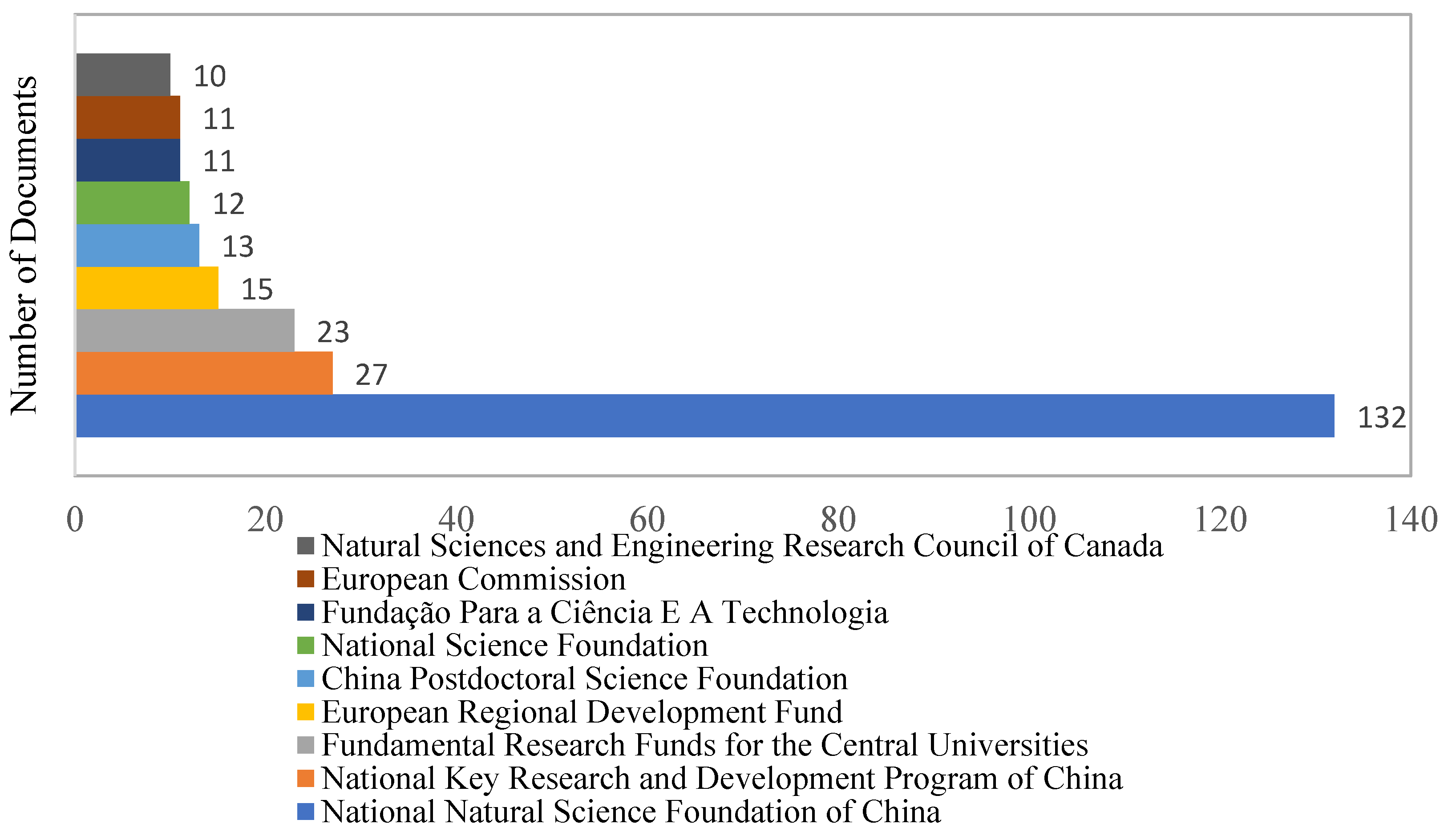 Figure 5 shows publication trends from 2010 to 2025 for five major journals: “Chemical Engineering Journal,” “Water Research,” “Chemosphere,” “Science of the Total Environment,” and “Journal of Environmental Chemical Engineering.” From 2010 to 2014, publication activity was low across all journals, with “Water Research” showing the first contributions. Growth began in 2015, particularly in the “Chemical Engineering Journal” and “Chemosphere.” Between 2018 and 2021, output increased steadily, peaking in 2020 for several journals. In 2023, the “Chemical Engineering Journal” published eight articles, confirming its leadership, while “Water Research” maintained strong contributions. By 2025, “Journal of Environmental Chemical Engineering” had risen to seven publications, indicating expanding research attention across journals.