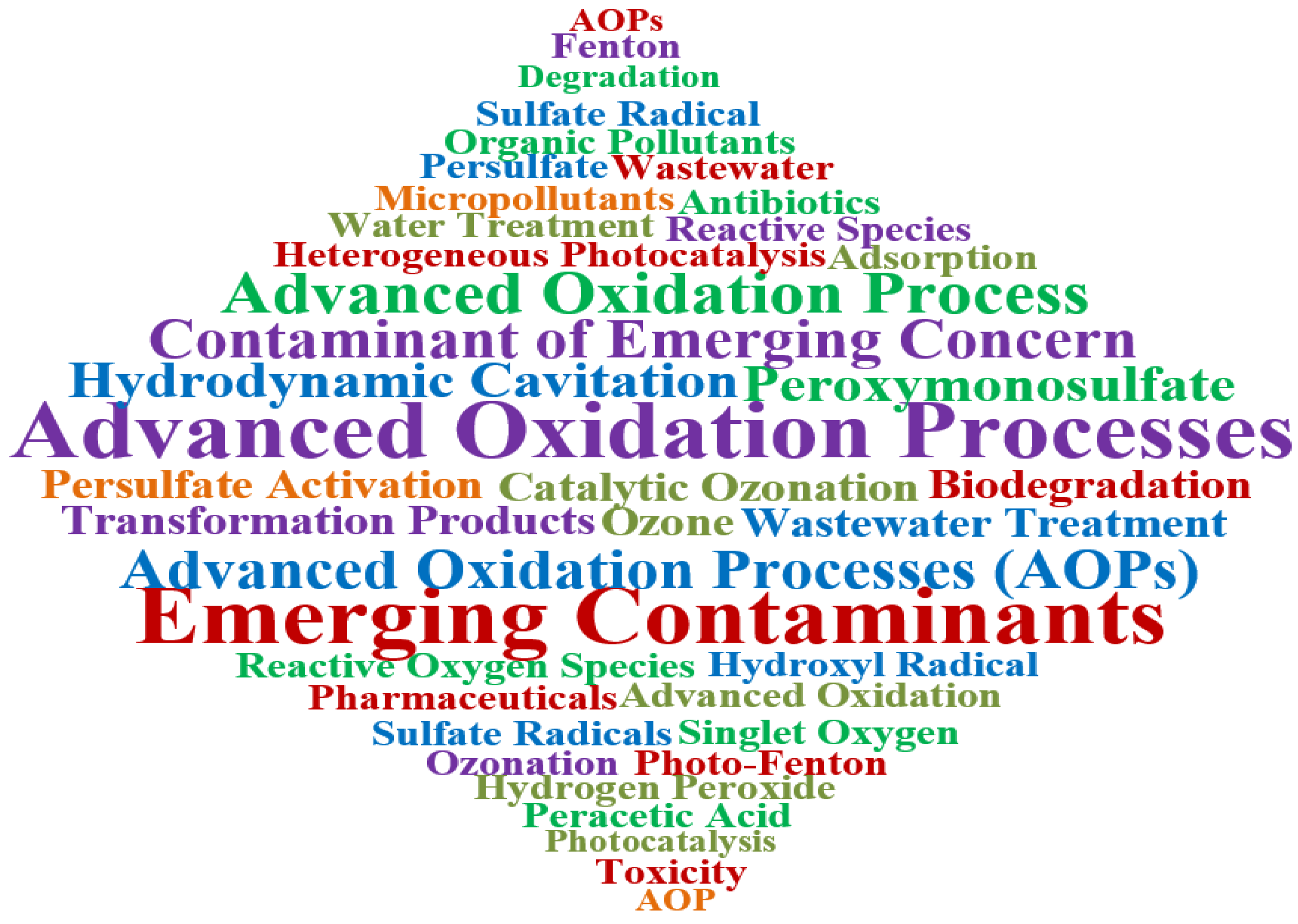 The spatial proximity and relative size of keywords suggest thematic linkages among degradation mechanisms, contaminant classes, and treatment strategies. For instance, the co-occurrence of AOP, Degradation, and Organic Pollutants reflects a strong focus on oxidation efficiency and degradation pathways, while terms such as Catalytic Ozonation and Persulfate Activation point to methodological specialization within AOP research. Overall, the word cloud provides a concise overview of the major research directions and methodological priorities in the field.