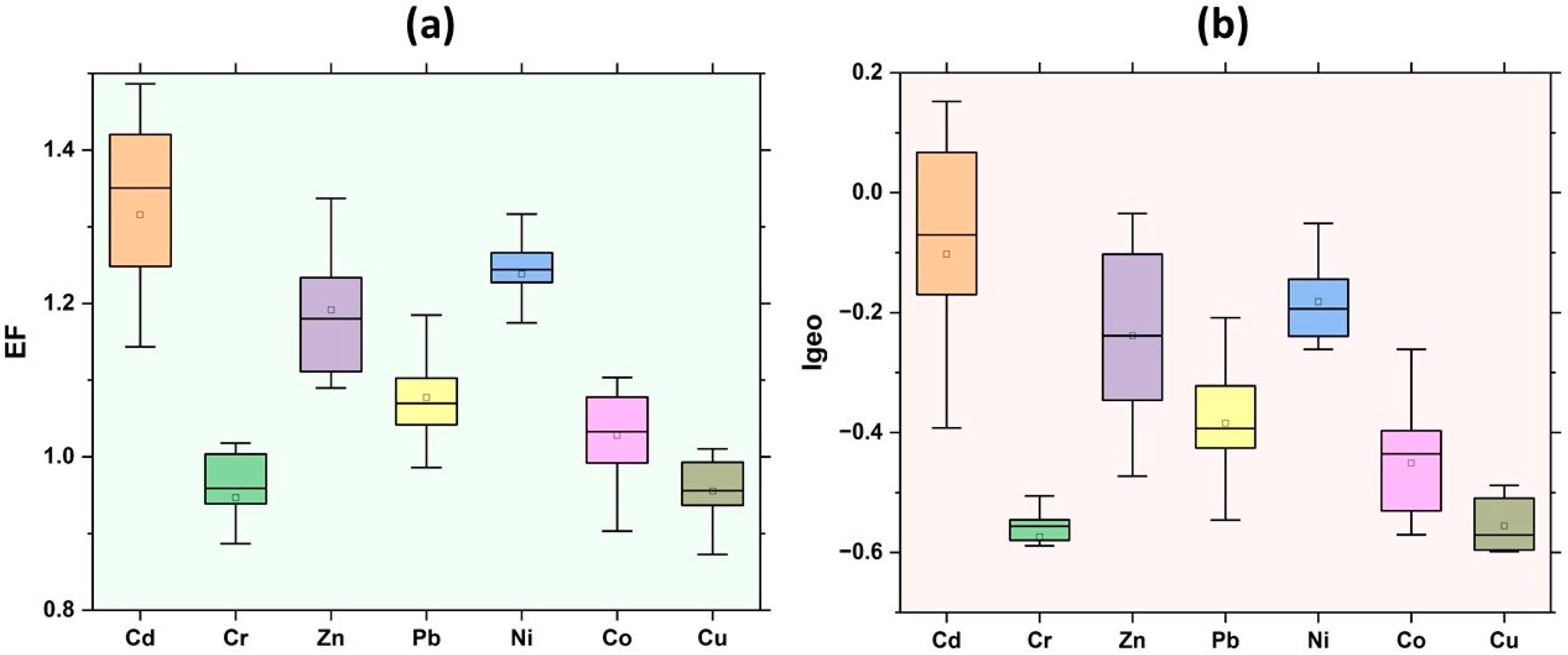 | 0 ≤ Igeo < 1 | Slight contamination | 0.5 ≤ EF < 1 | Slight contamination | ||