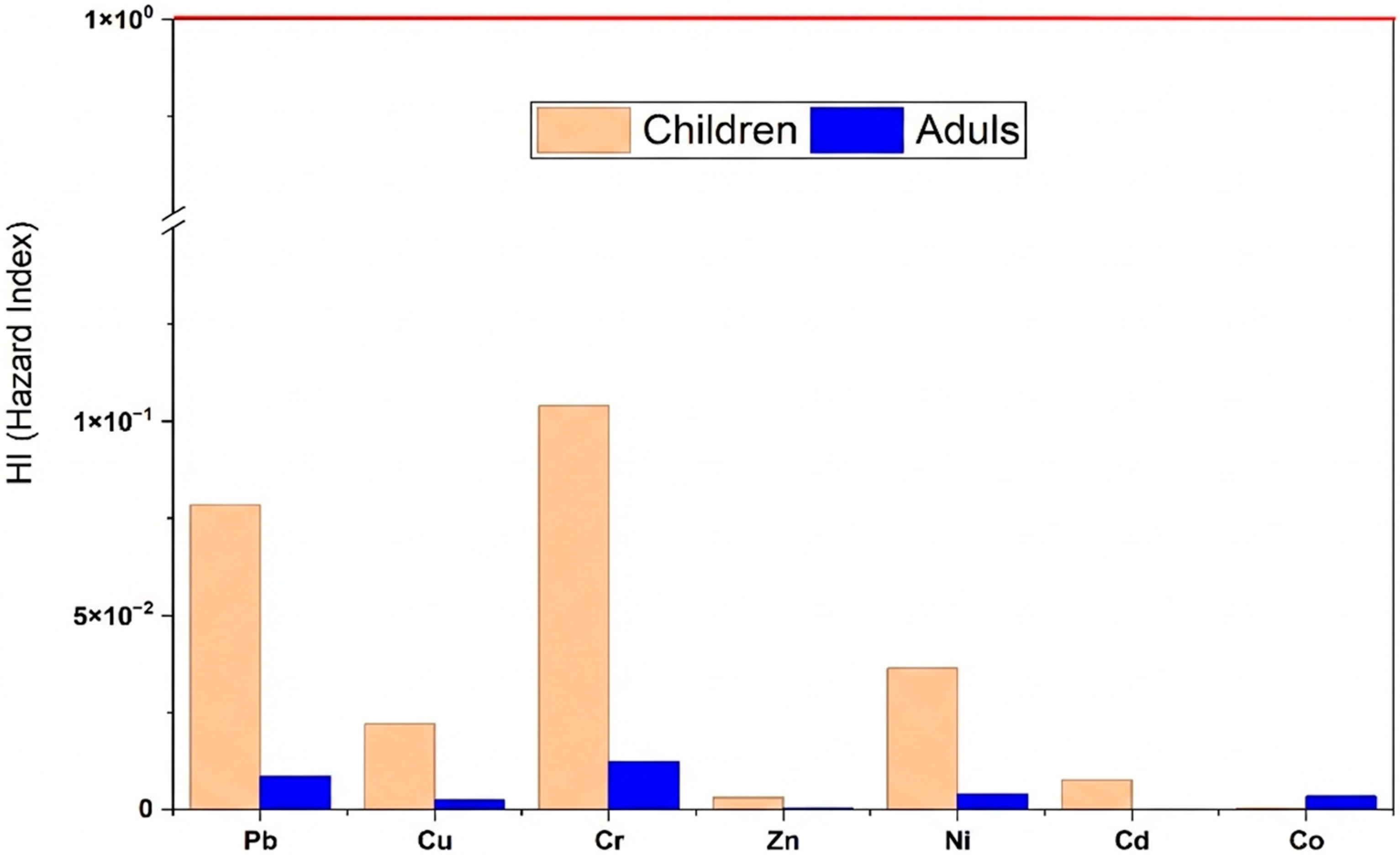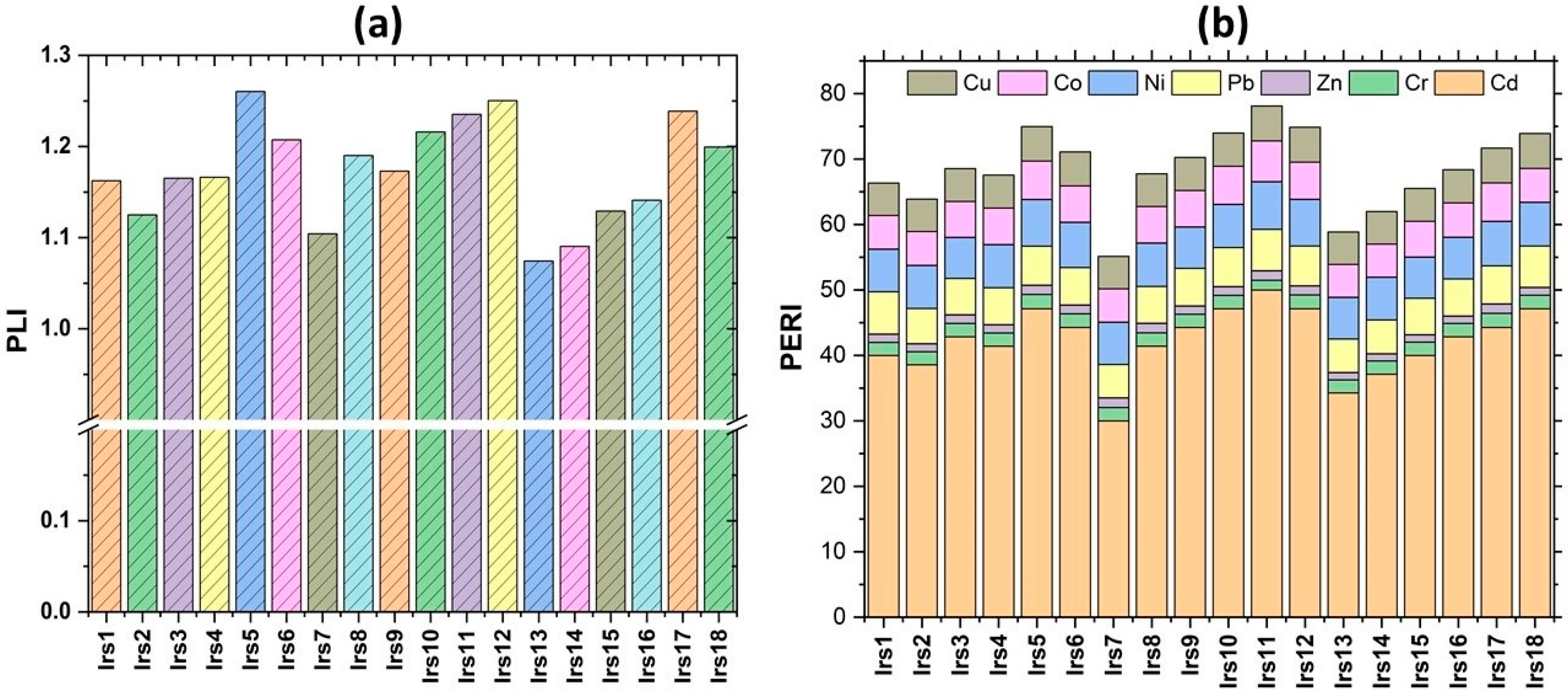 | PLI | Ei < 40 | Low risk | Potential ecological risk index (PERI) | PERI < 150 | Low risk |