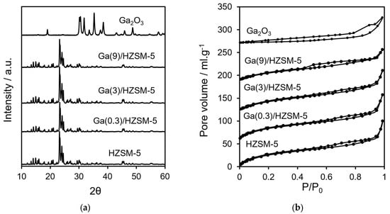 Table 1 shows ICP elemental analysis results for Ga(wt%)/HZSM-5 and Ga2O3. Figure 1a displays XRD profiles for HZSM-5 at various gallium loadings and for bulk Ga2O3. No reflections attributable to gallium oxide phases were observed at any loading, indicating either the formation of highly dispersed Ga2O3 nanoparticles within the HZSM-5 pores or the incorporation of Ga3+ ions into the framework in place of Al3+ (protons on the zeolite surface) [51].