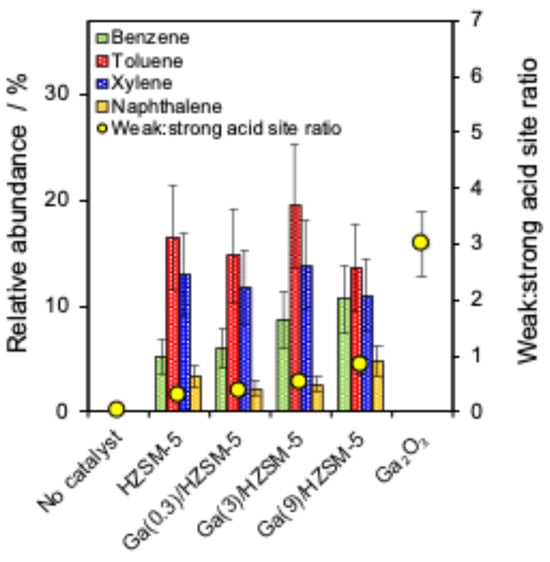 No BTX and naphthalene are produced in the absence of a catalyst and in the presence of a Ga2O3 catalyst for cellulose pyrolysis (Figure 5). Pure HZSM-5 produced toluene, xylene and naphthalene with no significant changes compared to Ga(0.3)/HZSM-5, Ga(3)/HZSM-5, and Ga(9)/HZSM-5 catalysts. However, adding more gallium to HZSM-5 gradually increased the benzene aromatic [62,80], accompanied by elevated Lewis acidity and an increased weak-to-strong acid site ratio (Figure 5). Adjaye et al. reported that light organics from cellulose can be deoxygenated and cracked with zeolite catalysts into C2-C6 olefins, which then aromatise them into benzene, toluene, xylene, and other aromatics [81]. Cheng et al. studied that HZSM-5 formed more toluene and xylene than Ga/HZSM-5, while Ga/HZSM-5 increased benzene yield compared with HZSM-5 [41]. Thus, HZSM-5 is a selective catalyst for BTX formation [82], but the selectivity toward benzene on Ga/HZSM-5 increased with the weak-to-strong acid site ratio, indicating a preference for weak Lewis acid sites. While environmental fuel standards limit aromatic content in finished fuels, increasing aromatics during catalytic pyrolysis remains valuable. Ga-modified HZSM-5 enhances deoxygenation and energy density of bio-oil, producing mainly monocyclic aromatics that can be further upgraded or refined to meet fuel regulations [38,83]. Therefore, Ga-modified catalysts can be justified as an intermediate step toward higher-quality bio-oil production or the production of valuable chemicals.