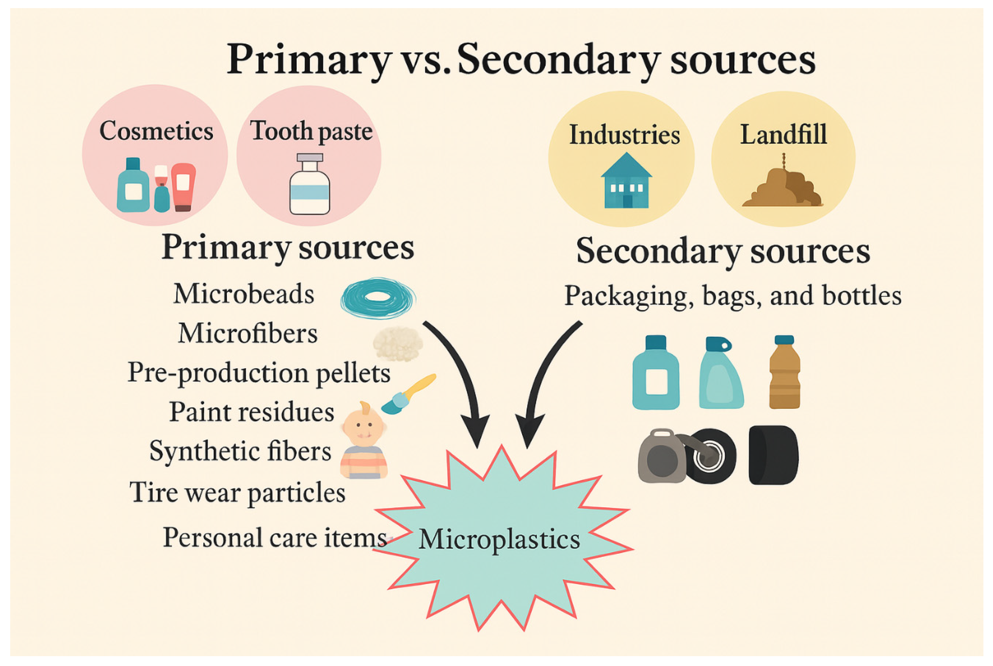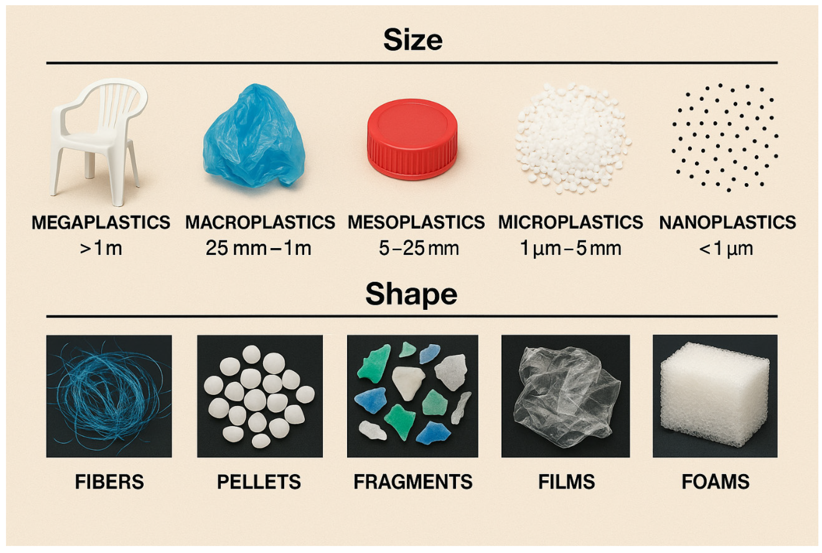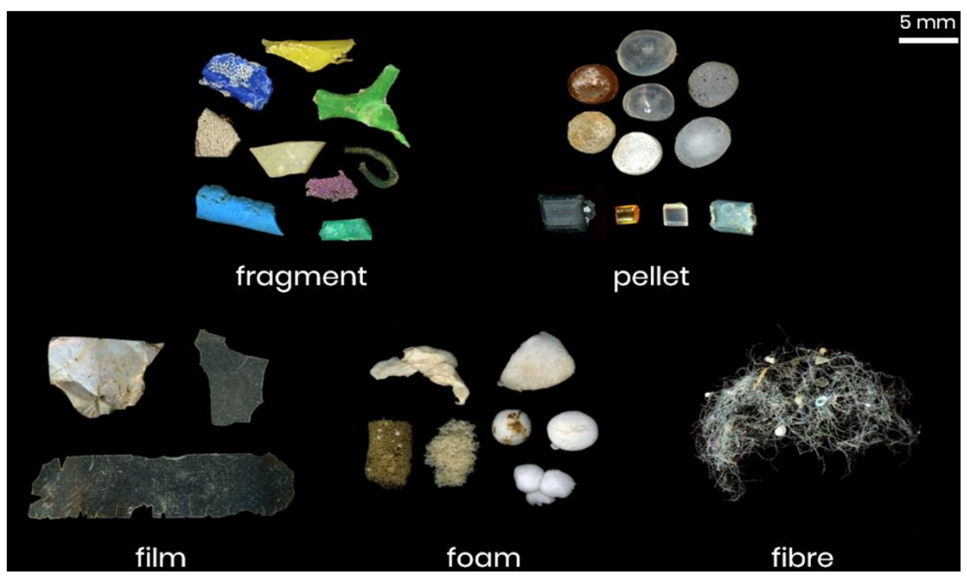 | Primary MPs | Microbeads, Pre-production Pellets | <5 mm in size, used in cosmetics and manufacturing. | [74] |